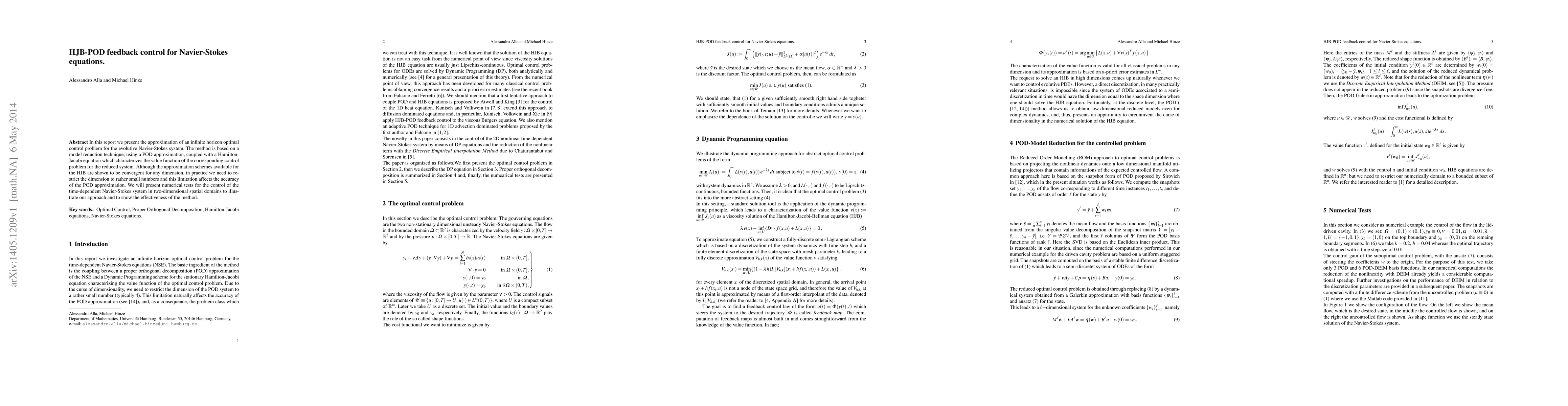 In this report we present the approximation of an infinite horizon optimal control problem for the evolutive Navier-Stokes system. The method is based on a model reduction technique, using a POD approximation, coupled with a Hamilton-Jacobi equation which characterizes the value function of the corresponding control problem for the reduced system. Although the approximation schemes available for the HJB are shown to be convergent for any dimension, in practice we need to restrict the dimension to rather small numbers and this limitation affects the accuracy of the POD approximation. We will present numerical tests for the control of the time-dependent Navier-Stokes system in two-dimensional spatial domains to illustrate our approach and to show the effectiveness of the method.