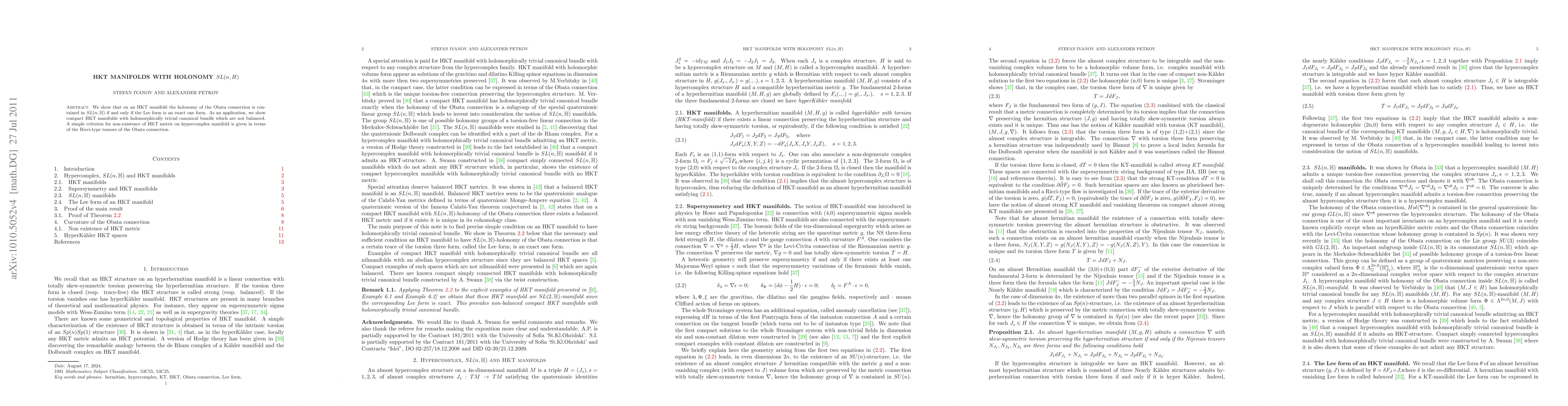 This paper demonstrates that on HKT manifolds, the holonomy group of the Obata connection is contained in SL(n,H) if and only if the Lee form is exact. It also provides an application showing compact HKT manifolds with non-balanced holomorphically trivial canonical bundles. Additionally, a criterion for the non-existence of HKT metrics on hypercomplex manifolds is presented using Ricci-type tensors of the Obata connection.