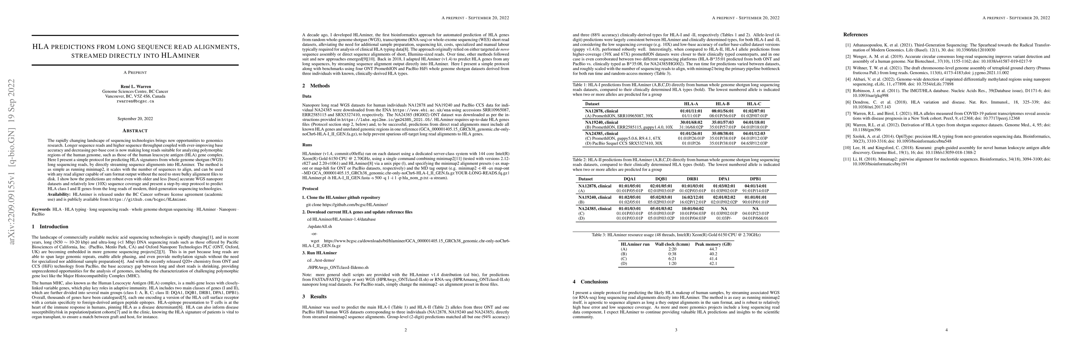 This paper introduces a streamlined protocol for predicting HLA signatures using long sequence reads from whole genome shotgun sequencing, directly streaming alignments into HLAminer. The method leverages minimap2 and scales efficiently, making it applicable to modern third-generation sequencing technologies, even with older, less accurate datasets.