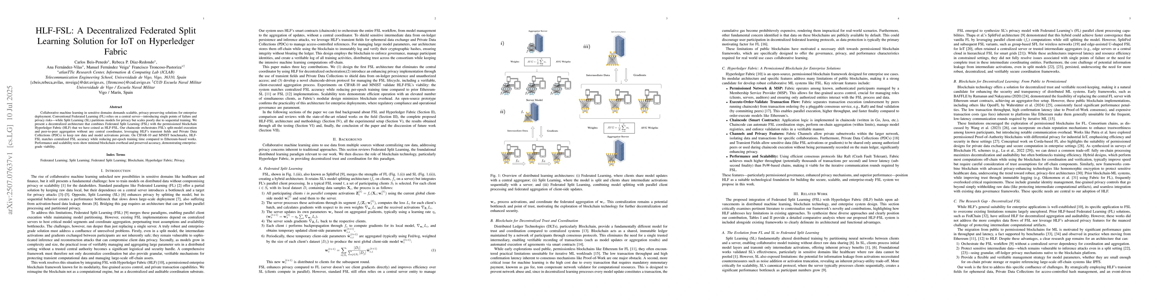 Collaborative machine learning in sensitive domains demands scalable, privacy preserving solutions for enterprise deployment. Conventional Federated Learning (FL) relies on a central server, introducing single points of failure and privacy risks, while Split Learning (SL) partitions models for privacy but scales poorly due to sequential training. We present a decentralized architecture that combines Federated Split Learning (FSL) with the permissioned blockchain Hyperledger Fabric (HLF). Our chaincode orchestrates FSL's split model execution and peer-to-peer aggregation without any central coordinator, leveraging HLF's transient fields and Private Data Collections (PDCs) to keep raw data and model activations private. On CIFAR-10 and MNIST benchmarks, HLF-FSL matches centralized FSL accuracy while reducing per epoch training time compared to Ethereum-based works. Performance and scalability tests show minimal blockchain overhead and preserved accuracy, demonstrating enterprise grade viability.