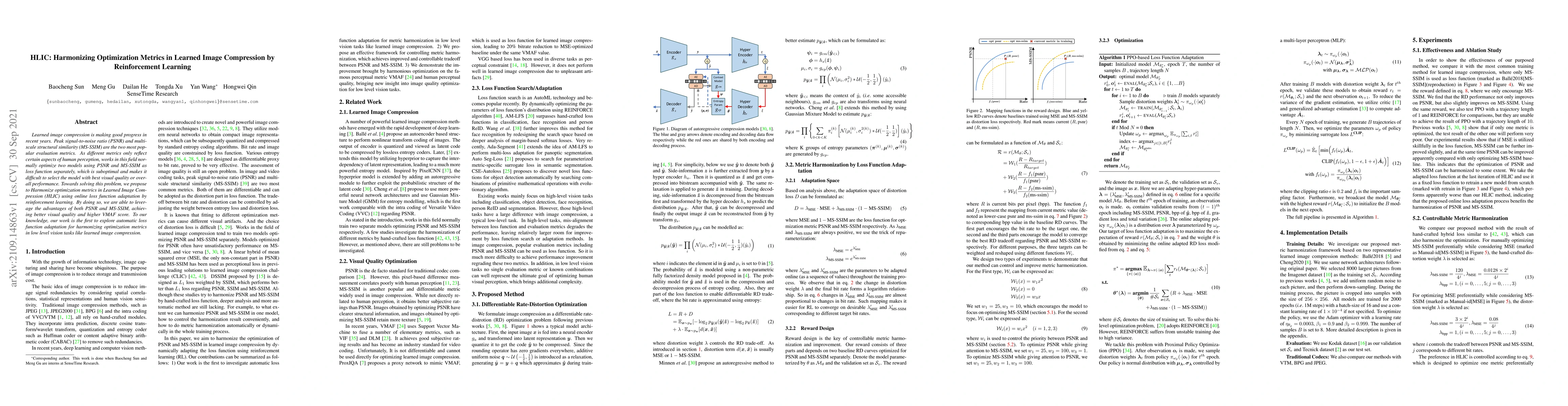 Learned image compression is making good progress in recent years. Peak signal-to-noise ratio (PSNR) and multi-scale structural similarity (MS-SSIM) are the two most popular evaluation metrics. As different metrics only reflect certain aspects of human perception, works in this field normally optimize two models using PSNR and MS-SSIM as loss function separately, which is suboptimal and makes it difficult to select the model with best visual quality or overall performance. Towards solving this problem, we propose to Harmonize optimization metrics in Learned Image Compression (HLIC) using online loss function adaptation by reinforcement learning. By doing so, we are able to leverage the advantages of both PSNR and MS-SSIM, achieving better visual quality and higher VMAF score. To our knowledge, our work is the first to explore automatic loss function adaptation for harmonizing optimization metrics in low level vision tasks like learned image compression.