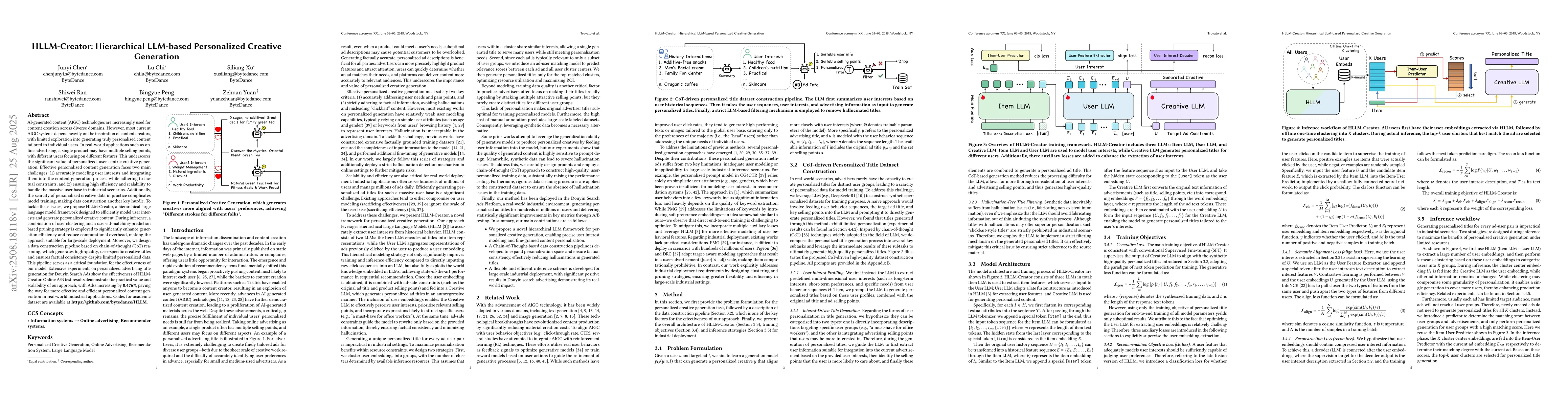 AI-generated content technologies are widely used in content creation. However, current AIGC systems rely heavily on creators' inspiration, rarely generating truly user-personalized content. In real-world applications such as online advertising, a single product may have multiple selling points, with different users focusing on different features. This underscores the significant value of personalized, user-centric creative generation. Effective personalized content generation faces two main challenges: (1) accurately modeling user interests and integrating them into the content generation process while adhering to factual constraints, and (2) ensuring high efficiency and scalability to handle the massive user base in industrial scenarios. Additionally, the scarcity of personalized creative data in practice complicates model training, making data construction another key hurdle. We propose HLLM-Creator, a hierarchical LLM framework for efficient user interest modeling and personalized content generation. During inference, a combination of user clustering and a user-ad-matching-prediction based pruning strategy is employed to significantly enhance generation efficiency and reduce computational overhead, making the approach suitable for large-scale deployment. Moreover, we design a data construction pipeline based on chain-of-thought reasoning, which generates high-quality, user-specific creative titles and ensures factual consistency despite limited personalized data. This pipeline serves as a critical foundation for the effectiveness of our model. Extensive experiments on personalized title generation for Douyin Search Ads show the effectiveness of HLLM-Creator. Online A/B test shows a 0.476% increase on Adss, paving the way for more effective and efficient personalized generation in industrial scenarios. Codes for academic dataset are available at https://github.com/bytedance/HLLM.