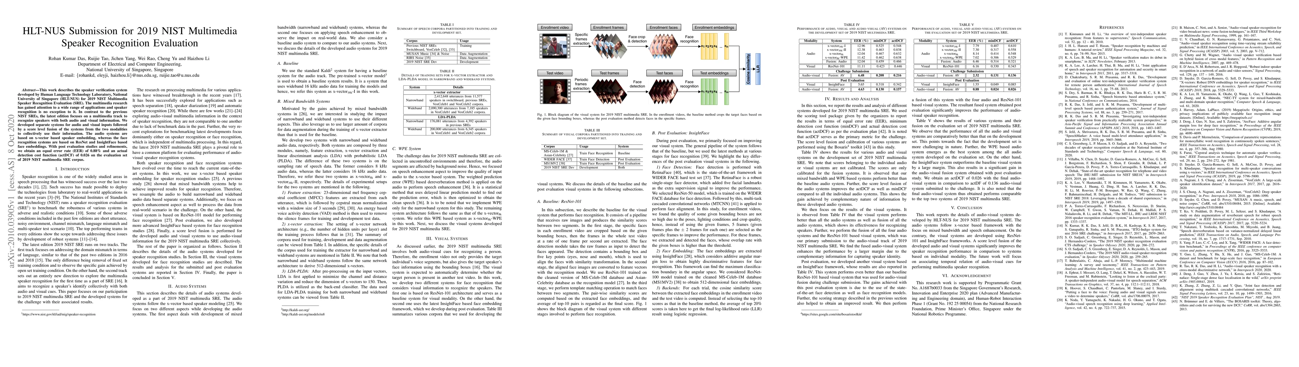 The HLT-NUS team developed a speaker verification system for the 2019 NIST Multimedia Speaker Recognition Evaluation, combining audio-based x-vector embeddings and visual-based ResNet and InsightFace face embeddings, achieving an EER of 0.88% and an actDCF of 0.026.