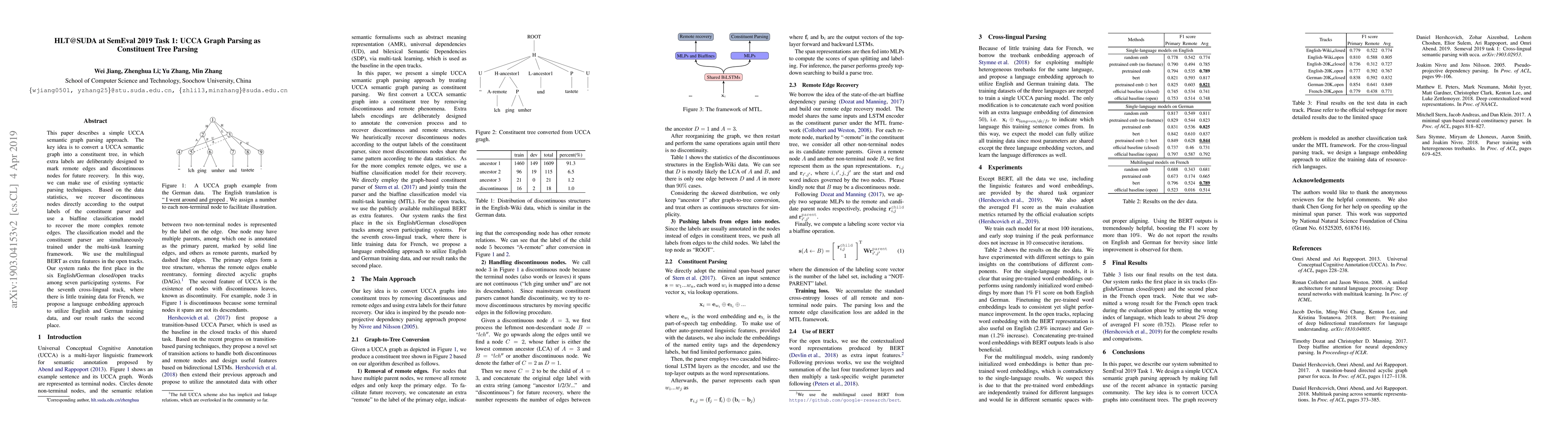 This paper presents a UCCA semantic graph parsing approach that converts graphs into constituent trees, employing extra labels for discontinuous nodes and remote edges, trained under a multi-task learning framework. The system ranks first in six English/German tracks and second in the cross-lingual French track, using multilingual BERT features and a language embedding approach.