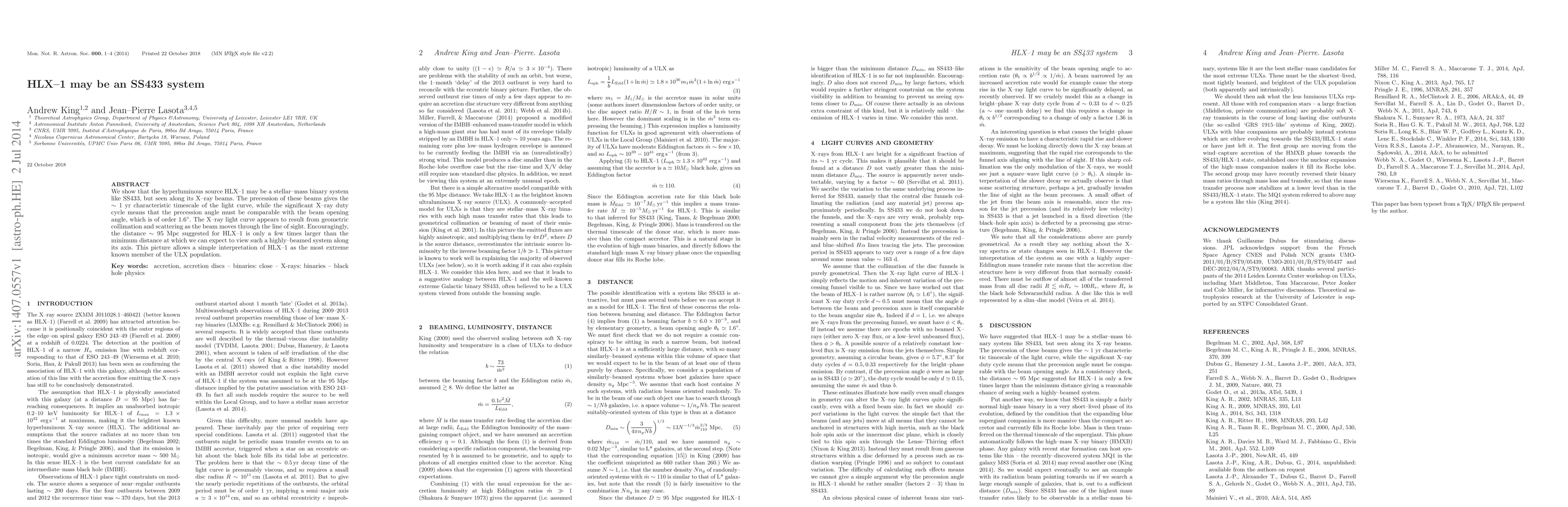 We show that the hyperluminous source HLX--1 may be a stellar--mass binary system like SS433, but seen along its X--ray beams. The precession of these beams gives the $\sim 1$~yr characteristic timescale of the light curve, while the significant X--ray duty cycle means that the precession angle must be comparable with the beam opening angle, which is of order $1.6^{\circ}$. The X--ray light curve appears to result from geometric collimation and scattering as the beam moves through the line of sight. Encouragingly, the distance $\sim 95$~Mpc suggested for HLX--1 is only a few times larger than the minimum distance at which we can expect to view such a highly--beamed system along its axis. This picture allows a simple interpretation of HLX--1 as the most extreme known member of the ULX population.