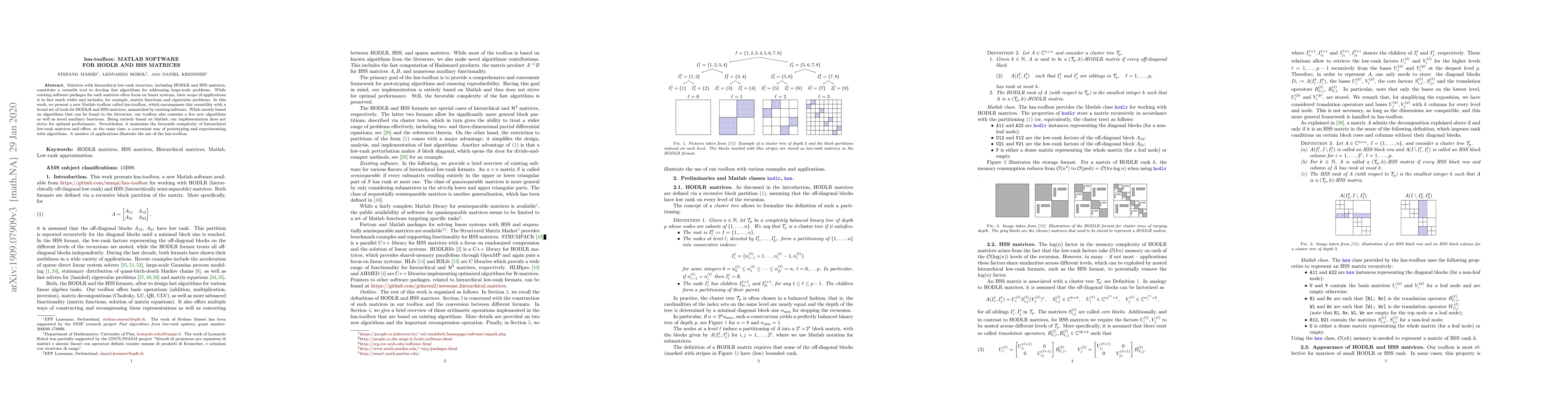 The hm-toolbox is a Matlab software suite for handling HODLR and HSS matrices, offering a wide range of tools for various applications beyond linear systems, including matrix functions and eigenvalue problems. While not optimized for performance, it maintains the efficiency of hierarchical low-rank structures and facilitates prototyping and experimentation.