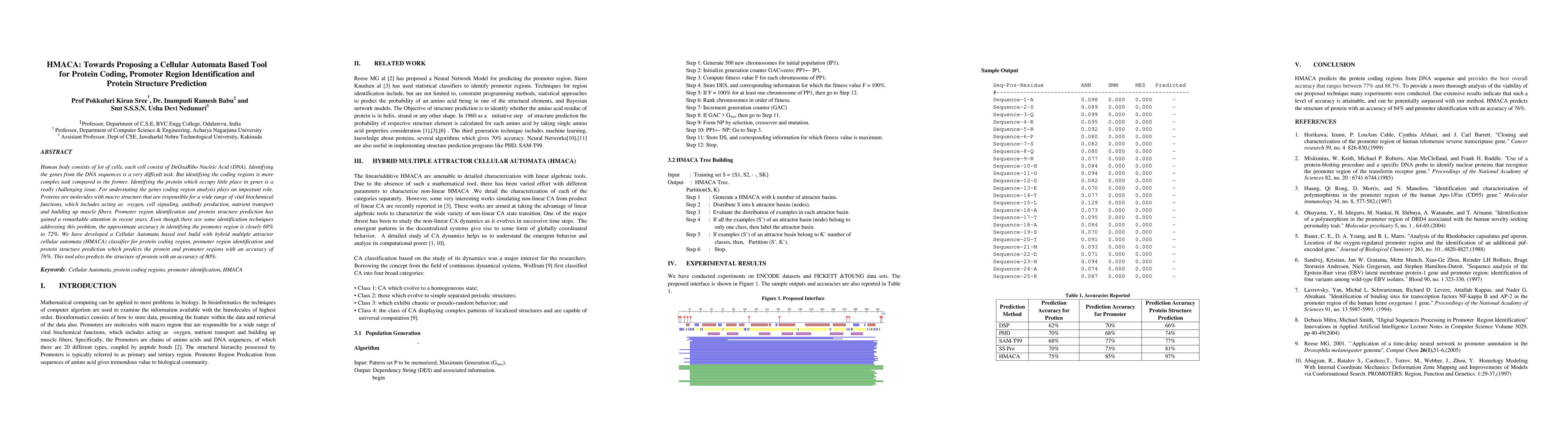 The paper introduces HMACA, a Cellular Automata based tool for identifying protein coding regions, promoter regions, and predicting protein structures, achieving accuracies of 76% and 80% respectively, surpassing existing methods. The tool aims to enhance the understanding of gene coding regions and the vital biochemical functions of proteins.