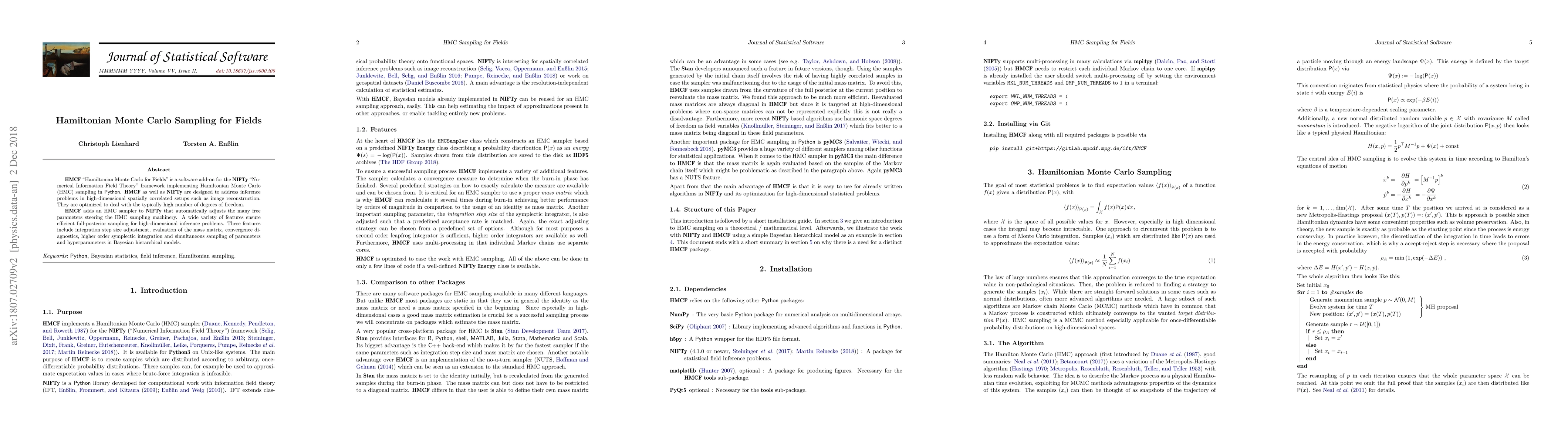 HMCF "Hamiltonian Monte Carlo for Fields" is a software add-on for the NIFTy "Numerical Information Field Theory" framework implementing Hamiltonian Monte Carlo (HMC) sampling in Python. HMCF as well as NIFTy are designed to address inference problems in high-dimensional spatially correlated setups such as image reconstruction. HMCF adds an HMC sampler to NIFTy that automatically adjusts the many free parameters steering the HMC sampling machinery. A wide variety of features ensure efficient full-posterior sampling for high-dimensional inference problems. These features include integration step size adjustment, evaluation of the mass matrix, convergence diagnostics, higher order symplectic integration and simultaneous sampling of parameters and hyperparameters in Bayesian hierarchical models.
