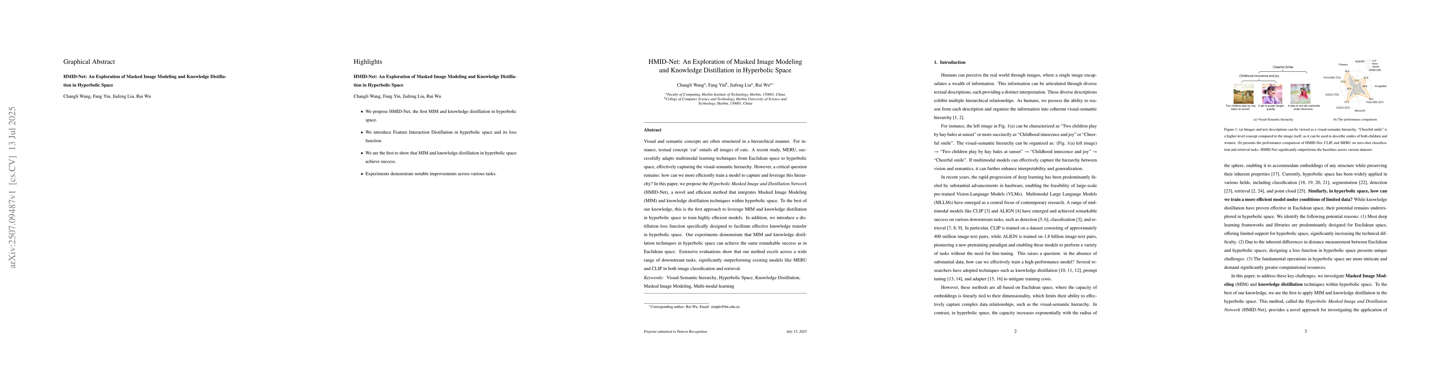 Visual and semantic concepts are often structured in a hierarchical manner. For instance, textual concept `cat' entails all images of cats. A recent study, MERU, successfully adapts multimodal learning techniques from Euclidean space to hyperbolic space, effectively capturing the visual-semantic hierarchy. However, a critical question remains: how can we more efficiently train a model to capture and leverage this hierarchy? In this paper, we propose the \textit{Hyperbolic Masked Image and Distillation Network} (HMID-Net), a novel and efficient method that integrates Masked Image Modeling (MIM) and knowledge distillation techniques within hyperbolic space. To the best of our knowledge, this is the first approach to leverage MIM and knowledge distillation in hyperbolic space to train highly efficient models. In addition, we introduce a distillation loss function specifically designed to facilitate effective knowledge transfer in hyperbolic space. Our experiments demonstrate that MIM and knowledge distillation techniques in hyperbolic space can achieve the same remarkable success as in Euclidean space. Extensive evaluations show that our method excels across a wide range of downstream tasks, significantly outperforming existing models like MERU and CLIP in both image classification and retrieval.