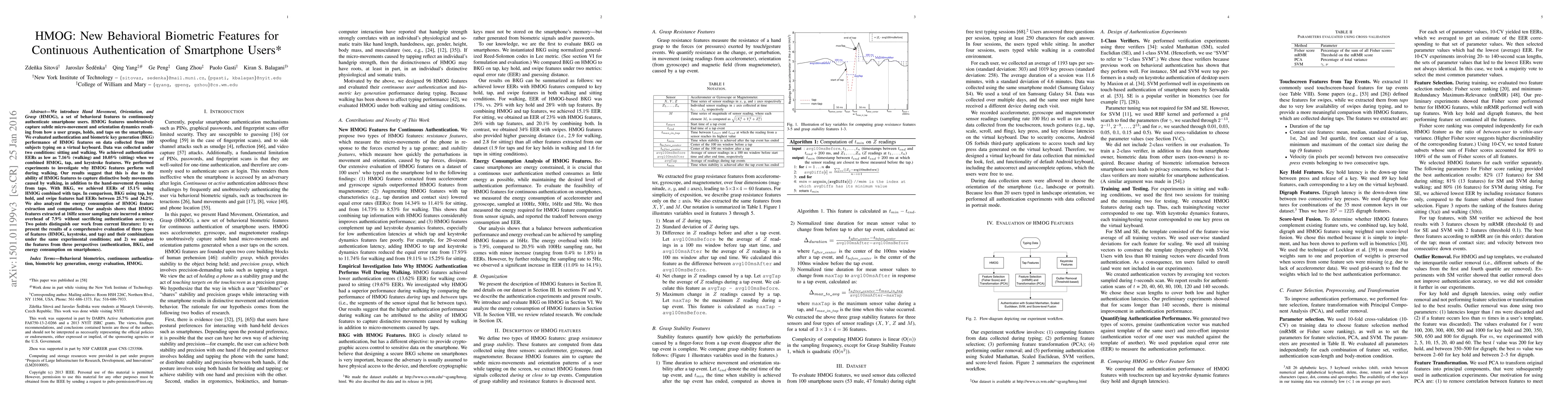 The research introduces HMOG, a set of behavioral biometric features for continuous smartphone user authentication, collected through accelerometer and gyroscope sensors under sitting and walking conditions from 100 subjects.