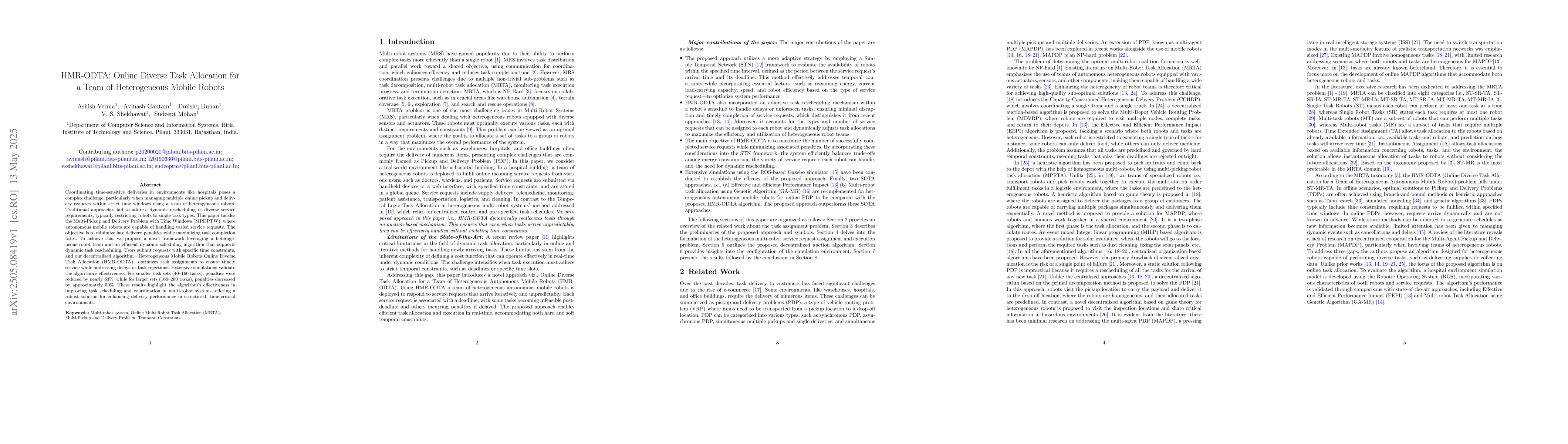 The paper proposes a decentralized algorithm, HMR-ODTA, for online diverse task allocation in a team of heterogeneous mobile robots, focusing on the Multi-Pickup and Delivery Problem with Time Windows (MPDPTW).