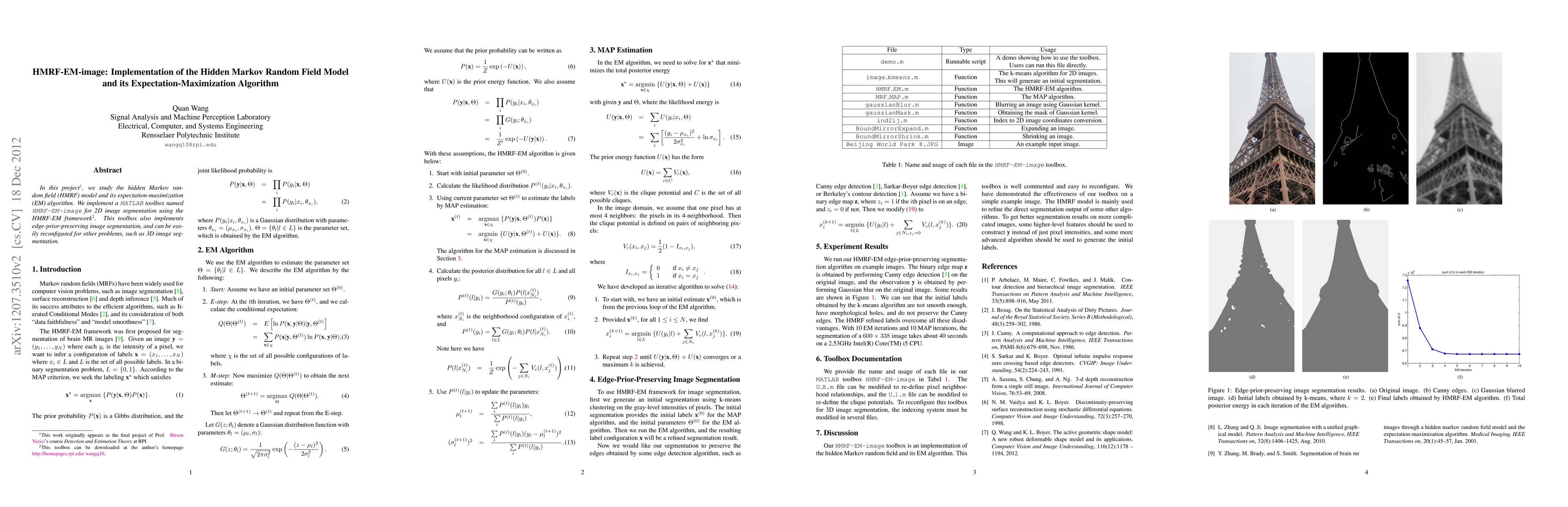 In this project, we study the hidden Markov random field (HMRF) model and its expectation-maximization (EM) algorithm. We implement a MATLAB toolbox named HMRF-EM-image for 2D image segmentation using the HMRF-EM framework. This toolbox also implements edge-prior-preserving image segmentation, and can be easily reconfigured for other problems, such as 3D image segmentation.