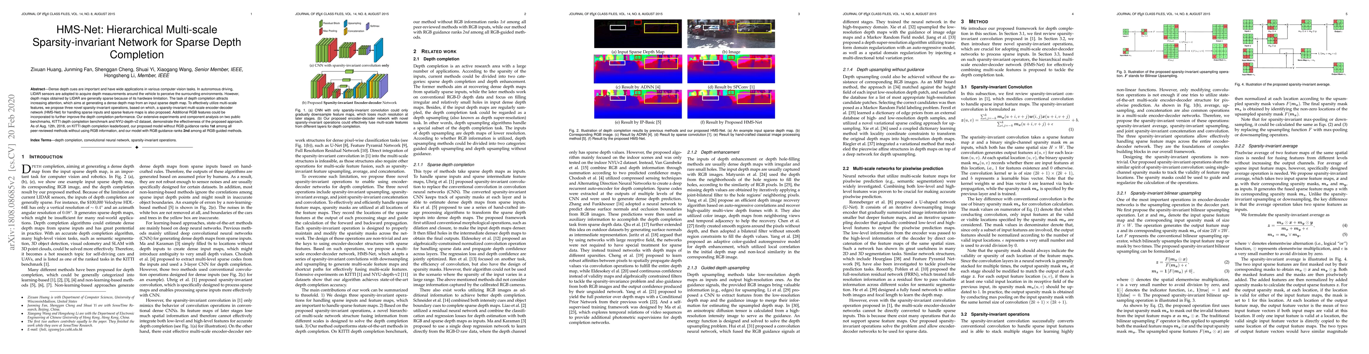 HMS-Net proposes a hierarchical multi-scale sparsity-invariant network for sparse depth completion, utilizing novel sparsity-invariant operations to generate dense depth maps from sparse LIDAR inputs. The model achieves top performance on KITTI and NYU-depth-v2 benchmarks, ranking first without RGB guidance and second with RGB integration.