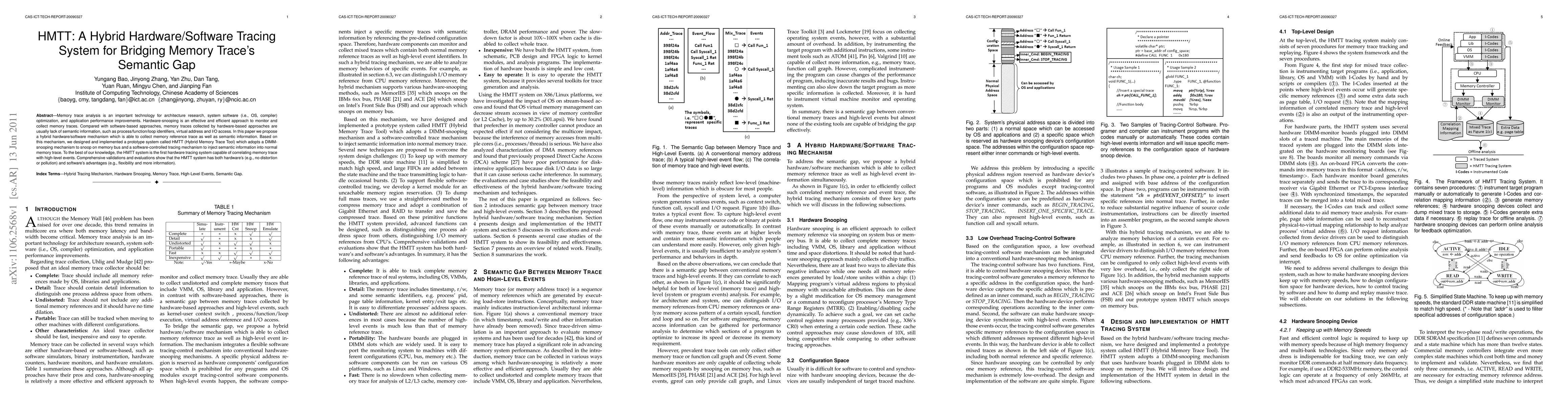 The paper proposes HMTT, a hybrid hardware/software tracing system that bridges the semantic gap in memory trace analysis by combining hardware-snooping for efficient trace collection with software-based methods for injecting semantic information, achieving both performance and flexibility. The HMTT system is validated to correlate memory traces with high-level events effectively.