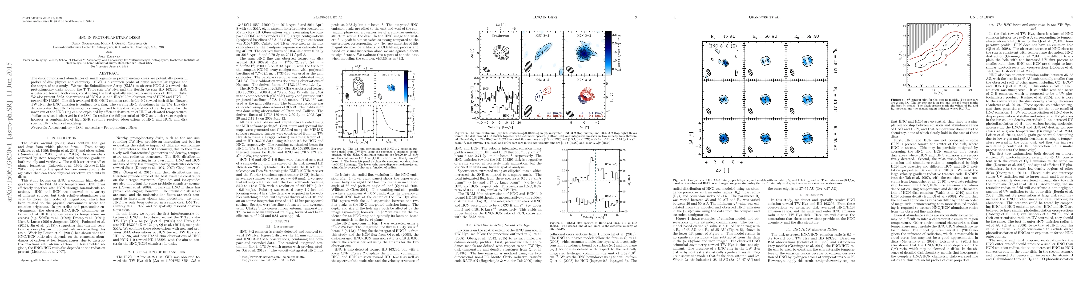 The distributions and abundances of small organics in protoplanetary disks are potentially powerful probes of disk physics and chemistry. HNC is a common probe of dense interstellar regions and the target of this study. We use the Submillimeter Array (SMA) to observe HNC 3--2 towards the protoplanetary disks around the T Tauri star TW Hya and the Herbig Ae star HD 163296. HNC is detected toward both disks, constituting the first spatially resolved observations of HNC in disks. We also present SMA observations of HCN 3--2, and IRAM 30m observations of HCN and HNC 1--0 toward HD 163296. The disk-averaged HNC/HCN emission ratio is 0.1--0.2 toward both disks. Toward TW Hya, the HNC emission is confined to a ring. The varying HNC abundance in the TW Hya disk demonstrates that HNC chemistry is strongly linked to the disk physical structure. In particular, the inner rim of the HNC ring can be explained by efficient destruction of HNC at elevated temperatures, similar to what is observed in the ISM. To realize the full potential of HNC as a disk tracer requires, however, a combination of high SNR spatially resolved observations of HNC and HCN, and disk specific HNC chemical modeling.