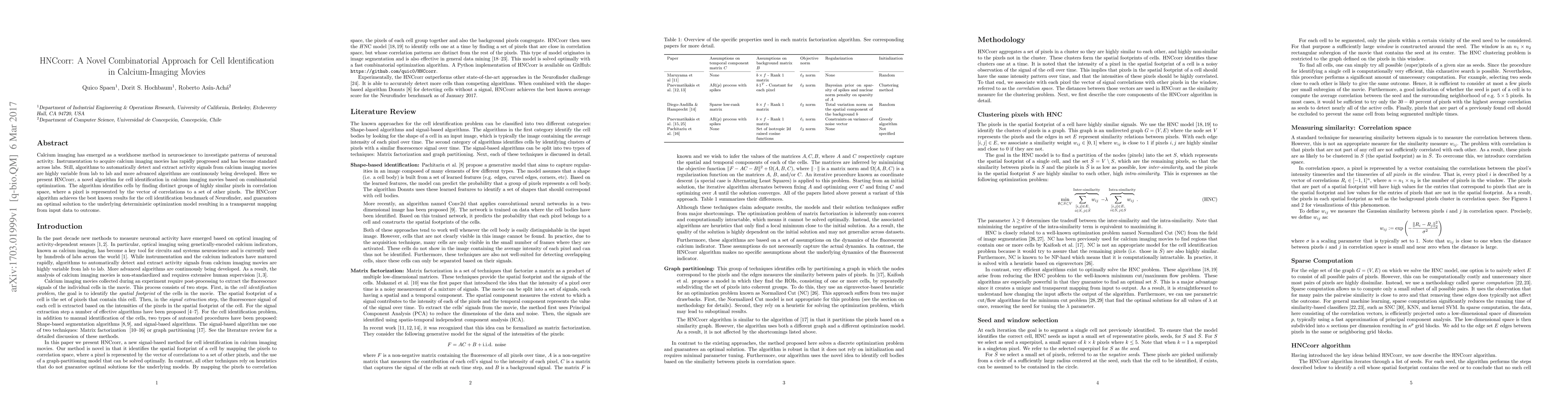 Calcium imaging has emerged as a workhorse method in neuroscience to investigate patterns of neuronal activity. Instrumentation to acquire calcium imaging movies has rapidly progressed and has become standard across labs. Still, algorithms to automatically detect and extract activity signals from calcium imaging movies are highly variable from~lab~to~lab and more advanced algorithms are continuously being developed. Here we present HNCcorr, a novel algorithm for cell identification in calcium imaging movies based on combinatorial optimization. The algorithm identifies cells by finding distinct groups of highly similar pixels in correlation space, where a pixel is represented by the vector of correlations to a set of other pixels. The HNCcorr algorithm achieves the best known results for the cell identification benchmark of Neurofinder, and guarantees an optimal solution to the underlying deterministic optimization model resulting in a transparent mapping from input data to outcome.