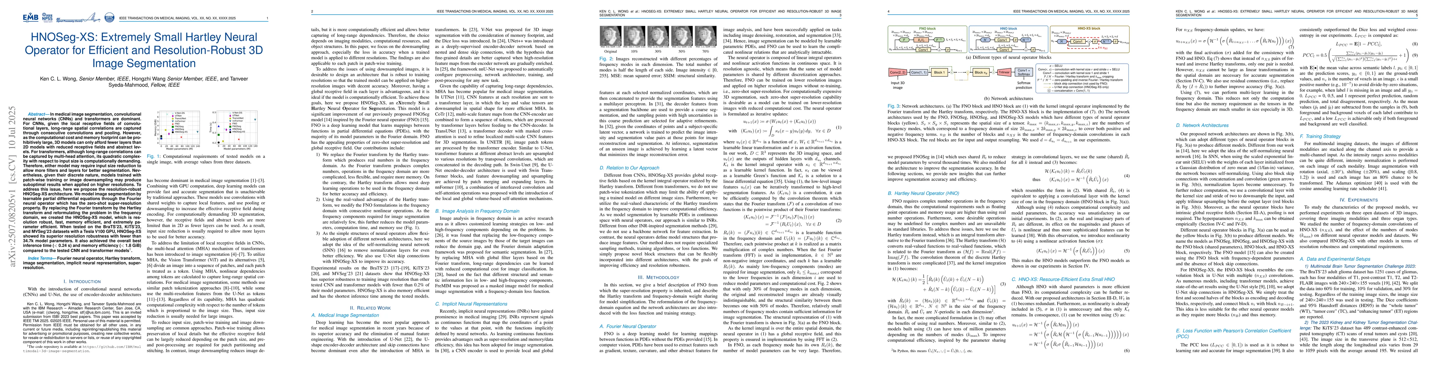 In medical image segmentation, convolutional neural networks (CNNs) and transformers are dominant. For CNNs, given the local receptive fields of convolutional layers, long-range spatial correlations are captured through consecutive convolutions and pooling. However, as the computational cost and memory footprint can be prohibitively large, 3D models can only afford fewer layers than 2D models with reduced receptive fields and abstract levels. For transformers, although long-range correlations can be captured by multi-head attention, its quadratic complexity with respect to input size is computationally demanding. Therefore, either model may require input size reduction to allow more filters and layers for better segmentation. Nevertheless, given their discrete nature, models trained with patch-wise training or image downsampling may produce suboptimal results when applied on higher resolutions. To address this issue, here we propose the resolution-robust HNOSeg-XS architecture. We model image segmentation by learnable partial differential equations through the Fourier neural operator which has the zero-shot super-resolution property. By replacing the Fourier transform by the Hartley transform and reformulating the problem in the frequency domain, we created the HNOSeg-XS model, which is resolution robust, fast, memory efficient, and extremely parameter efficient. When tested on the BraTS'23, KiTS'23, and MVSeg'23 datasets with a Tesla V100 GPU, HNOSeg-XS showed its superior resolution robustness with fewer than 34.7k model parameters. It also achieved the overall best inference time (< 0.24 s) and memory efficiency (< 1.8 GiB) compared to the tested CNN and transformer models.