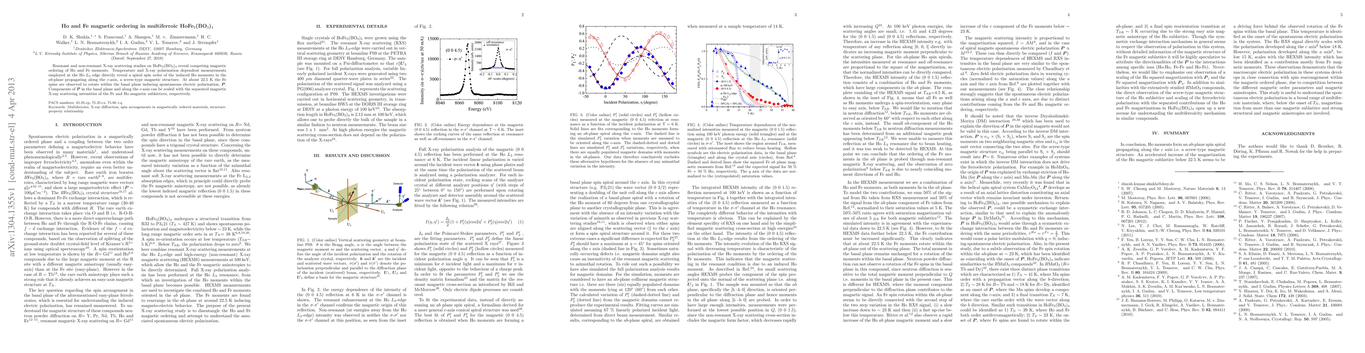 Resonant and non-resonant X-ray scattering studies on HoFe3(BO3)O4 reveal competing magnetic ordering of Ho and Fe moments. Temperature and X-ray polarization dependent measurements employed at the Ho L3 edge directly reveal a spiral spin order of the induced Ho moments in the ab-plane propagating along the c-axis, a screw-type magnetic structure. At about 22.5 K the Fe spins are observed to rotate within the basal plane inducing spontaneous electric polarization, P. Components of P in the basal plane and along the c-axis can be scaled with the separated magnetic X-ray scattering intensities of the Fe and Ho magnetic sublattices, respectively.