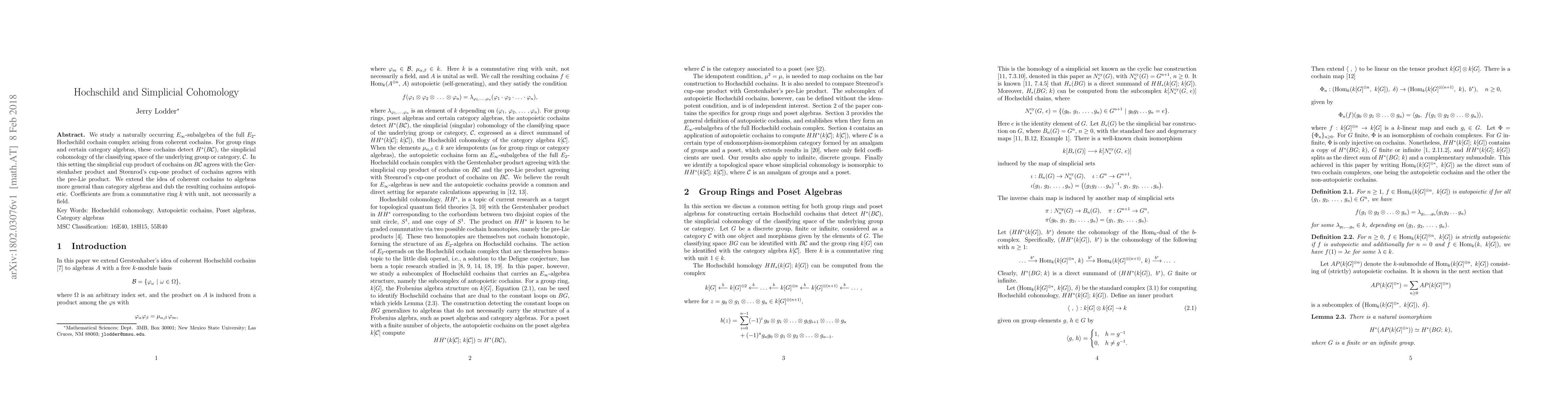 We study a naturally occurring $E_{\infty}$-subalgebra of the full $E_2$-Hochschild cochain complex arising from coherent cochains. For group rings and certain category algebras, these cochains detect $H^*(B {\cal{C}})$, the simplicial cohomology of the classifying space of the underlying group or category, $\cal{C}$. In this setting the simplicial cup product of cochains on $B{\cal{C}}$ agrees with the Gerstenhaber product and Steenrod's cup-one product of cochains agrees with the pre-Lie product. We extend the idea of coherent cochains to algebras more general than category algebras and dub the resulting cochains autopoietic. Coefficients are from a commutative ring $k$ with unit, not necessarily a field.