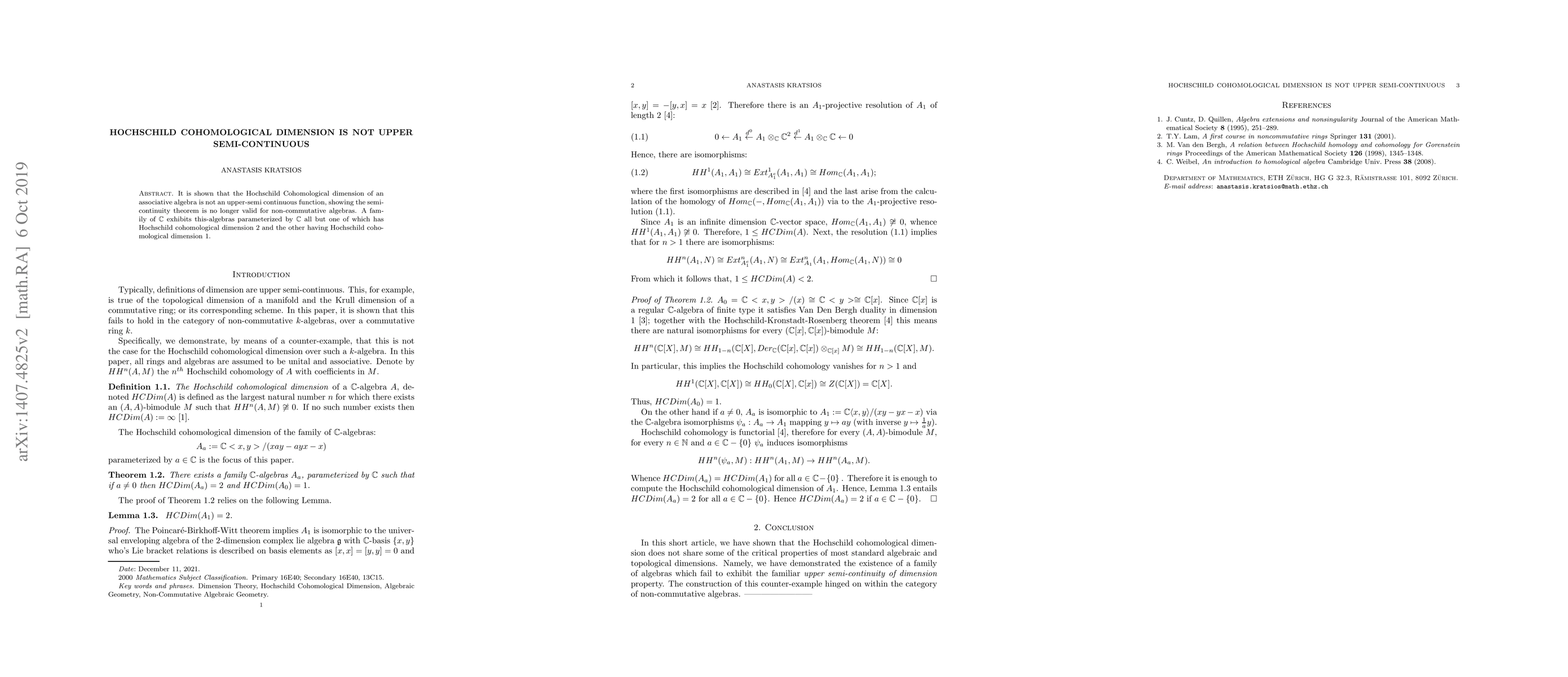 Summary: The paper demonstrates that the Hochschild Cohomological dimension of associative algebras fails to be upper semi-continuous, invalidating the semi-continuity theorem for non-commutative algebras. It presents a family of $\mathbb{C}$-parameterized algebras where all but one have dimension $2$ while the exception has dimension $1$.