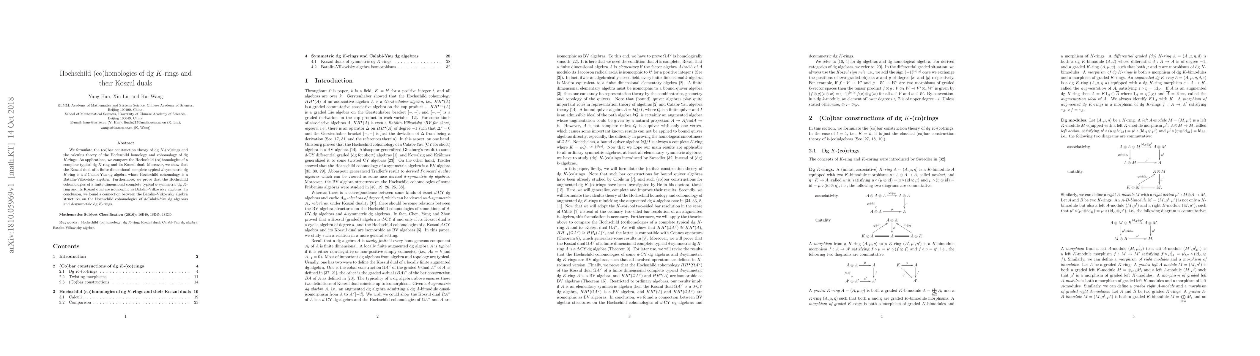We formulate the (co)bar construction theory of dg $K$-(co)rings and the calculus theory of the Hochschild homology and cohomology of dg $K$-rings. As applications, we compare the Hochschild (co)homologies of a complete typical dg $K$-ring and its Koszul dual. Moreover, we show that the Koszul dual of a finite dimensional complete typical $d$-symmetric dg $K$-ring is a $d$-Calabi-Yau dg algebra whose Hochschild cohomology is a Batalin-Vilkovisky algebra. Furthermore, we prove that the Hochschild cohomologies of a finite dimensional complete typical $d$-symmetric dg $K$-ring and its Koszul dual are isomorphic as Batalin-Vilkovisky algebras. In conclusion, we found a connection between the Batalin-Vilkovisky algebra structures on the Hochschild cohomologies of $d$-Calabi-Yau dg algebras and $d$-symmetric dg $K$-rings.
