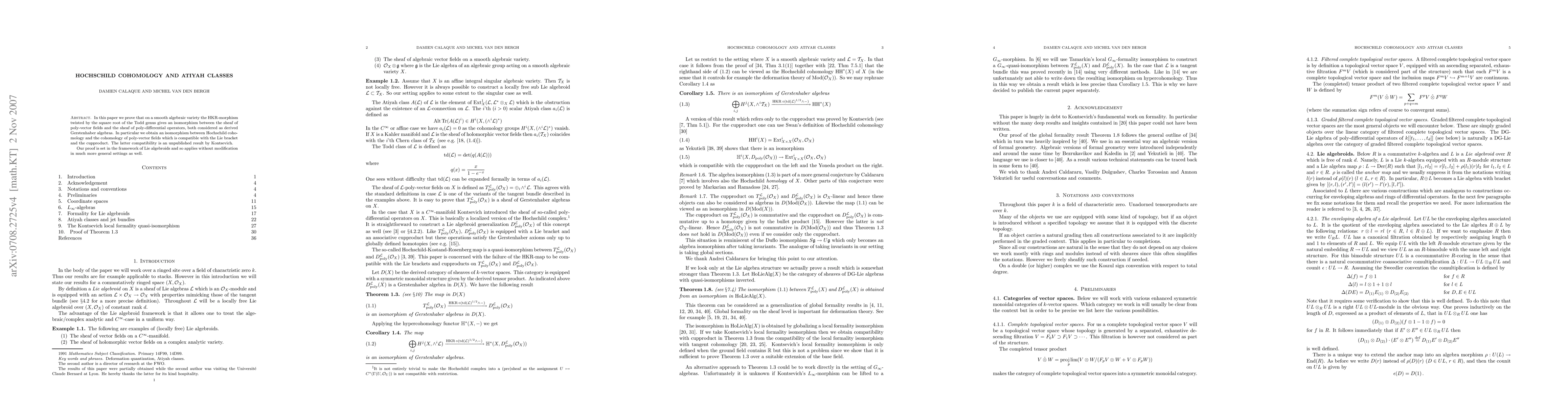In this paper we prove that on a smooth algebraic variety the HKR-morphism twisted by the square root of the Todd genus gives an isomorphism between the sheaf of poly-vector fields and the sheaf of poly-differential operators, both considered as derived Gerstenhaber algebras. In particular we obtain an isomorphism between Hochschild cohomology and the cohomology of poly-vector fields which is compatible with the Lie bracket and the cupproduct. The latter compatibility is an unpublished result by Kontsevich. Our proof is set in the framework of Lie algebroids and so applies without modification in much more general settings as well.