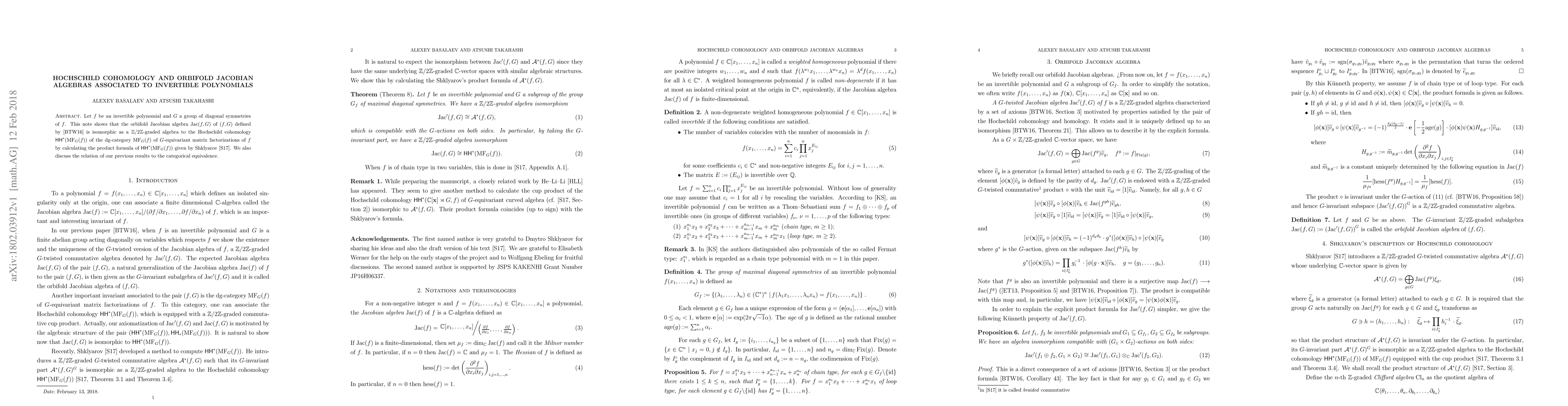 Let $f$ be an invertible polynomial and $G$ a group of diagonal symmetries of $f$. This note shows that the orbifold Jacobian algebra $\mathrm{Jac}(f,G)$ of $(f,G)$ defined by the authors and Elisabeth Werner in arXiv:1608.08962 is isomorphic as a $\mathbb{ZZ}/2\mathbb{ZZ}$-graded algebra to the Hochschild cohomology $\mathsf{HH}^*(\mathrm{MF}_G(f))$ of the dg-category $\mathrm{MF}_G(f)$ of $G$-equivariant matrix factorizations of $f$ by calculating the product formula of $\mathsf{HH}^*(\mathrm{MF}_G(f))$ given by Shklyarov in arXiv:1708.06030. We also discuss the relation of our previous results to the categorical equivalence.
