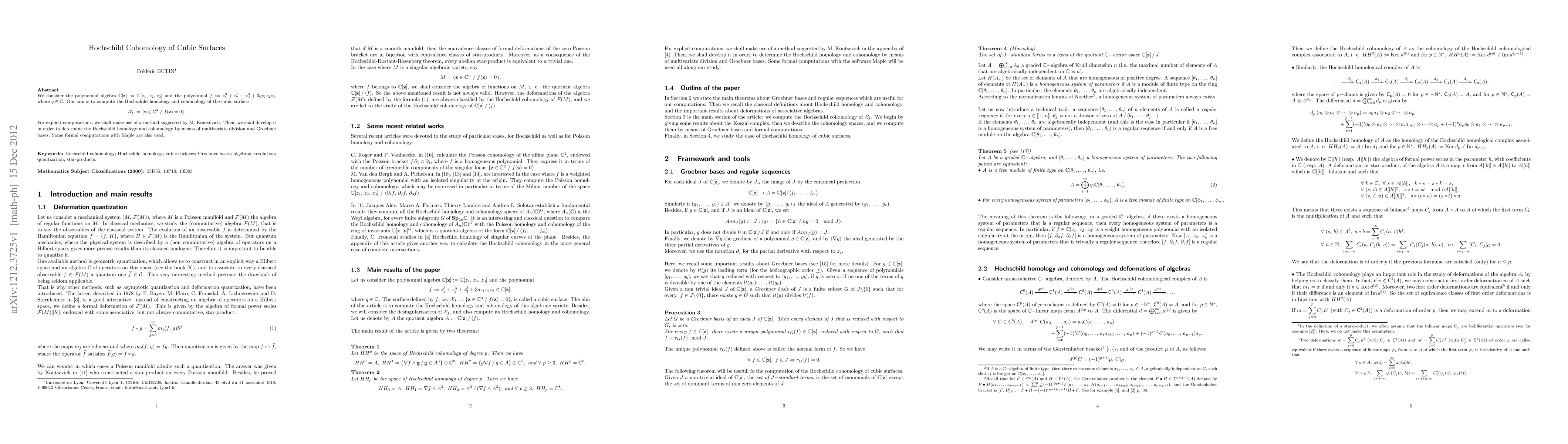 We consider the polynomial algebra $\mathbb{C}[\mathbf{z}]:=\mathbb{C}[z_1,\,z_2,\,z_3]$ and the polynomial $f:=z_1^3+z_2^3+z_3^3+3qz_1z_2z_3$, where $q\in \mathbb{C}$. Our aim is to compute the Hochschild homology and cohomology of the cubic surface $$\mathcal{X}_f:=\{\mathbf{z}\in\mathbb{C}^3\ /\ f(\mathbf{z})=0\}.$$ For explicit computations, we shall make use of a method suggested by M. Kontsevich. Then, we shall develop it in order to determine the Hochschild homology and cohomology by means of multivariate division and Groebner bases. Some formal computations with Maple are also used.