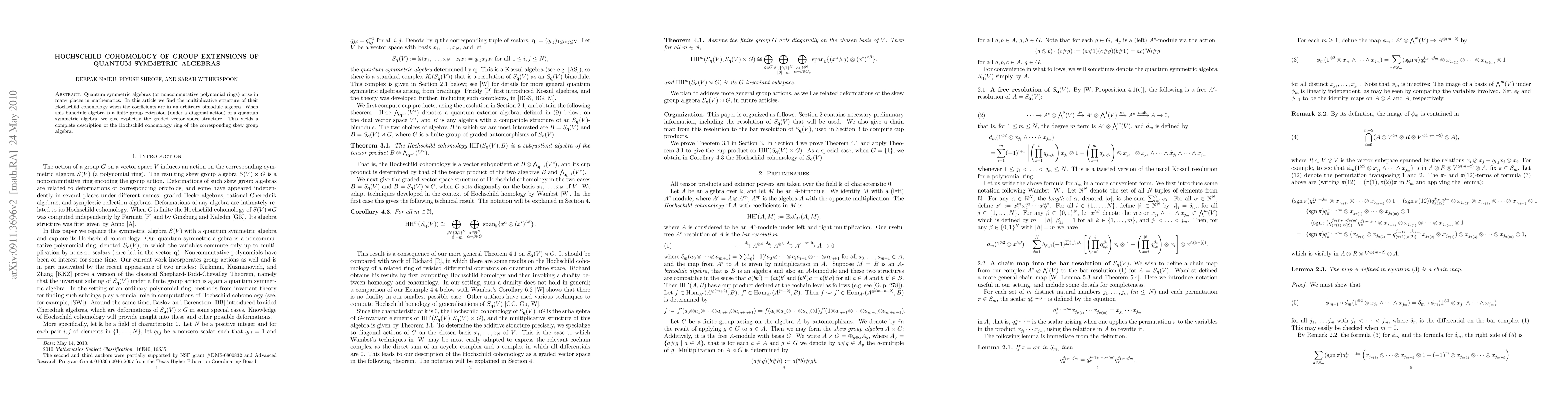 This paper determines the multiplicative structure of the Hochschild cohomology of quantum symmetric algebras when coefficients are in a bimodule algebra. It explicitly describes the graded vector space structure for Hochschild cohomology in the case where the bimodule algebra is a finite group extension of a quantum symmetric algebra, providing a complete ring structure for the resulting skew group algebra.