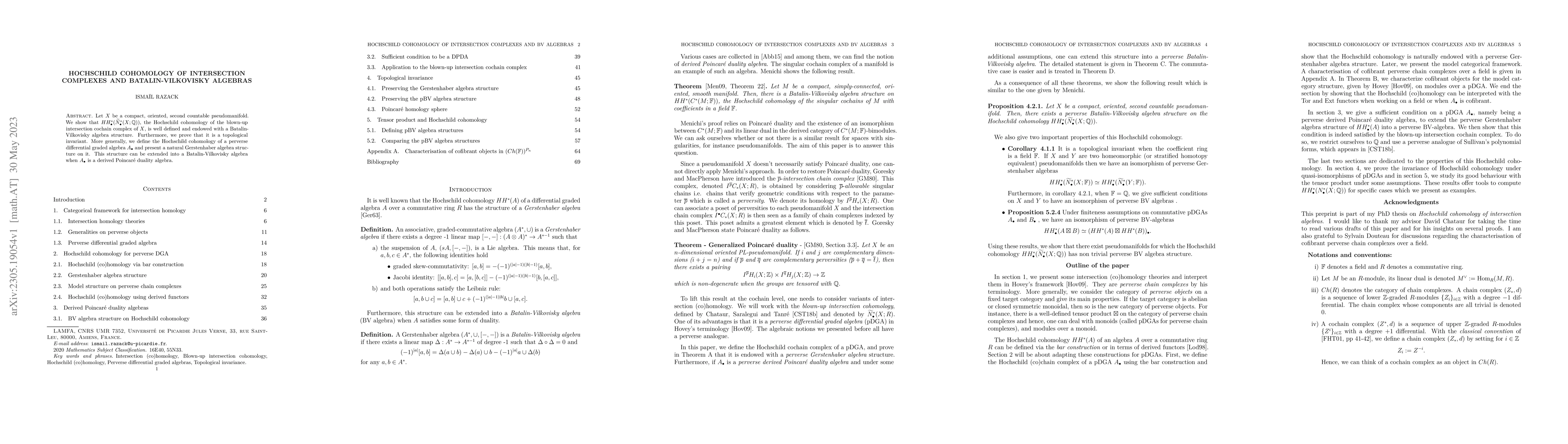 This paper demonstrates that the Hochschild cohomology of the intersection cochain complex of a pseudomanifold $X$ possesses a Batalin-Vilkovisky algebra structure and serves as a topological invariant. It also extends these findings to perverse differential graded algebras, providing a natural Gerstenhaber algebra structure that can be upgraded to Batalin-Vilkovisky when applicable.