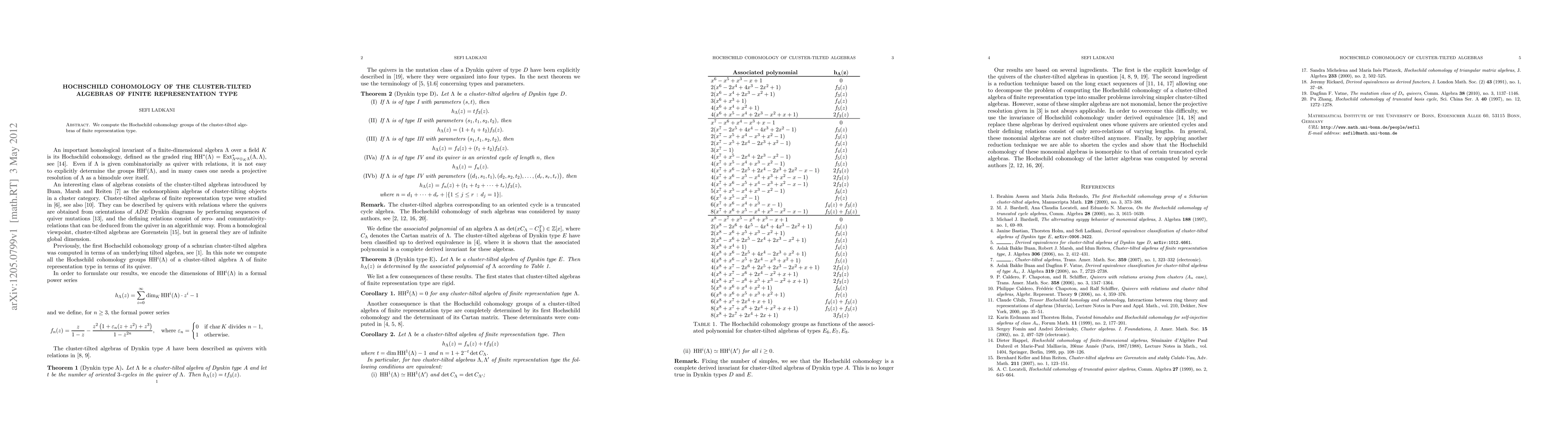 Summary: This paper computes the Hochschild cohomology groups for cluster-tilted algebras of finite representation type, providing insights into their homological properties. The findings contribute to the understanding of the structure and representation theory of these algebras.