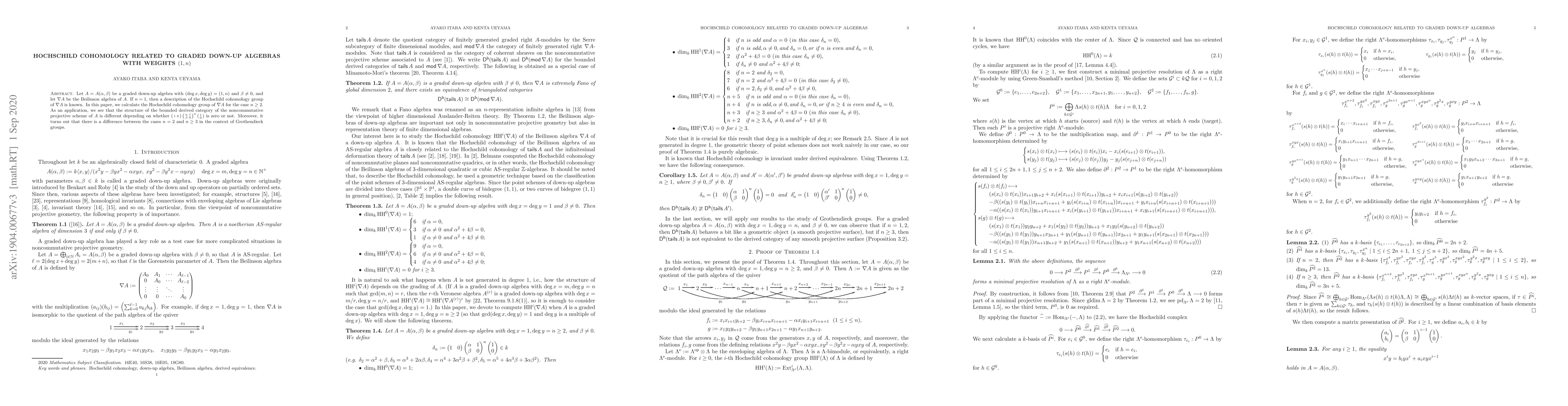 Let $A=A(\alpha, \beta)$ be a graded down-up algebra with $({\rm deg}\,x, {\rm deg}\,y)=(1,n)$ and $\beta \neq 0$, and let $\nabla A$ be the Beilinson algebra of $A$. If $n=1$, then a description of the Hochschild cohomology group of $\nabla A$ is known. In this paper, we calculate the Hochschild cohomology group of $\nabla A$ for the case $n \geq 2$. As an application, we see that the structure of the bounded derived category of the noncommutative projective scheme of $A$ is different depending on whether $\left(\begin{smallmatrix} 1&0 \end{smallmatrix}\right)\left(\begin{smallmatrix} \alpha &1 \\ \beta &0 \end{smallmatrix}\right)^n\left(\begin{smallmatrix} 1 \\ 0 \end{smallmatrix}\right)$ is zero or not. Moreover, it turns out that there is a difference between the cases $n=2$ and $n\geq 3$ in the context of Grothendieck groups.