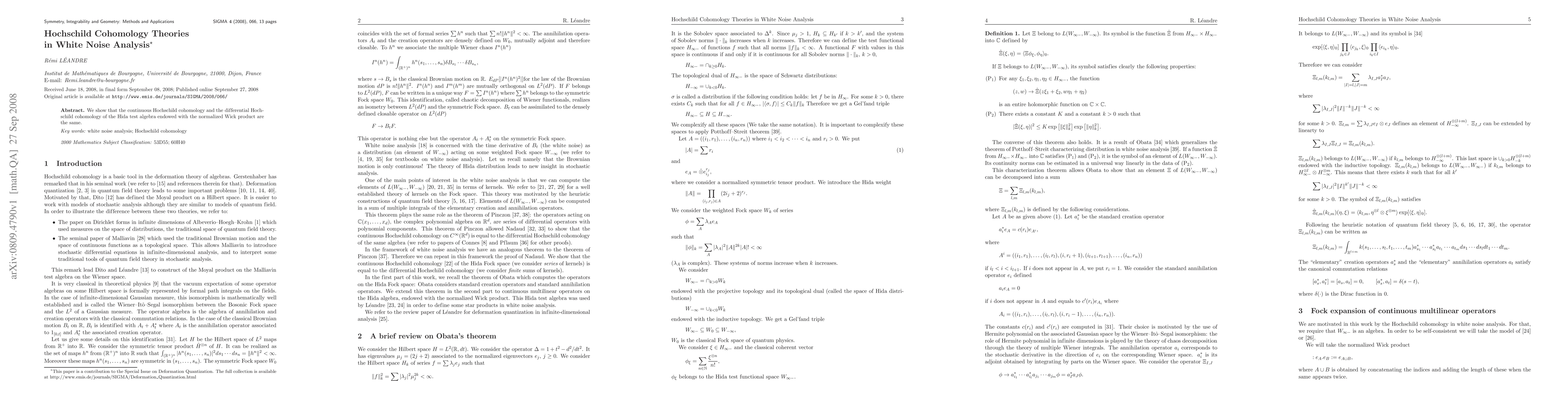 This research establishes that continuous Hochschild cohomology and differential Hochschild cohomology are equivalent for the Hida test algebra with normalized Wick product, thereby unifying these cohomology theories in white noise analysis.
