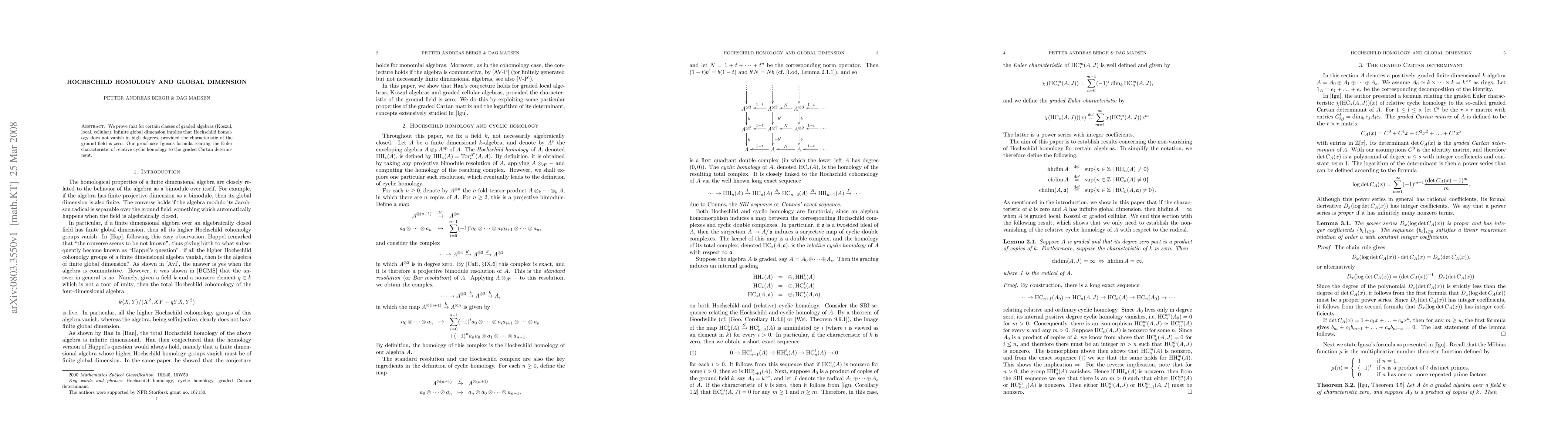 Summary: This paper demonstrates that for specific graded algebras (Koszul, local, cellular), infinite global dimension leads to non-vanishing Hochschild homology in high degrees when the ground field's characteristic is zero, using Igusa's formula to link relative cyclic homology's Euler characteristic with the graded Cartan determinant.