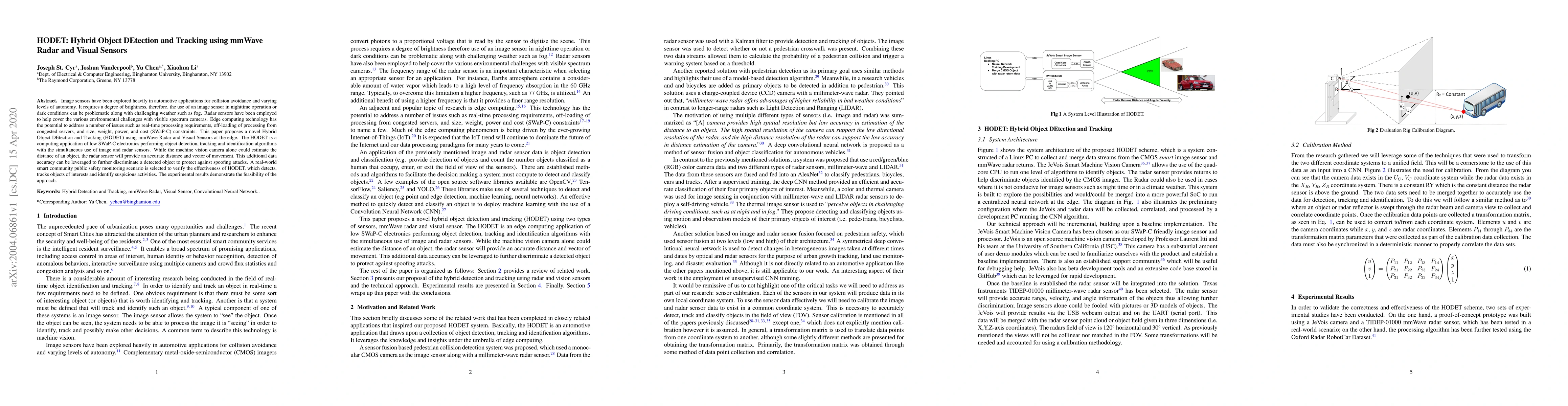 This paper proposes HODET, a hybrid system for object detection and tracking using both mmWave radar and visual sensors at the edge, addressing limitations of image sensors in low-light and adverse weather conditions. The system leverages radar for accurate distance and movement vectors, enhancing object discrimination and security against spoofing attacks, validated through a smart community public safety scenario.