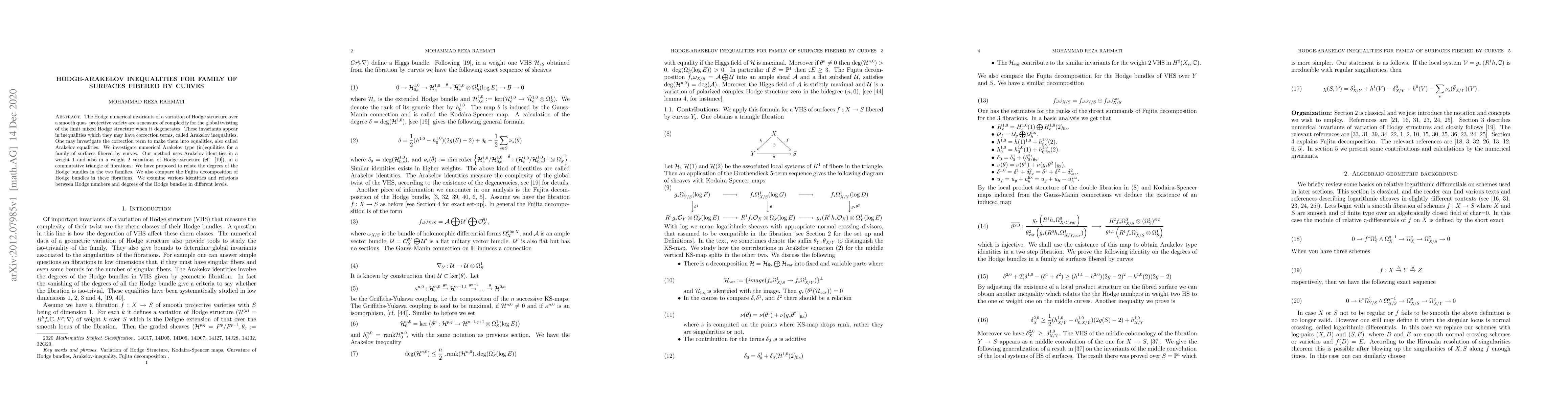 The Hodge numerical invariants of a variation of Hodge structure over a smooth quas--projective variety are a measure of complexity for the global twisting of the limit mixed Hodge structure when it degenerates. These invariants appear in inequalities which they may have correction terms, called Arakelov inequalities. One may investigate the correction term to make them into equalities, also called Arakelov equalities. We investigate numerical Arakelov type (in)equilities for a family of surfaces fibered by curves. Our method uses Arakelov identities in a weight 1 and also in a weight 2 variations of Hodge structure (cf. \cite{GGK}), in a commutative triangle of fibrations. We have proposed to relate the degrees of the Hodge bundles in the two families. We also compare the Fujita decomposition of Hodge bundles in these fibrations. We examine various identities and relations between Hodge numbers and degrees of the Hodge bundles in different levels.