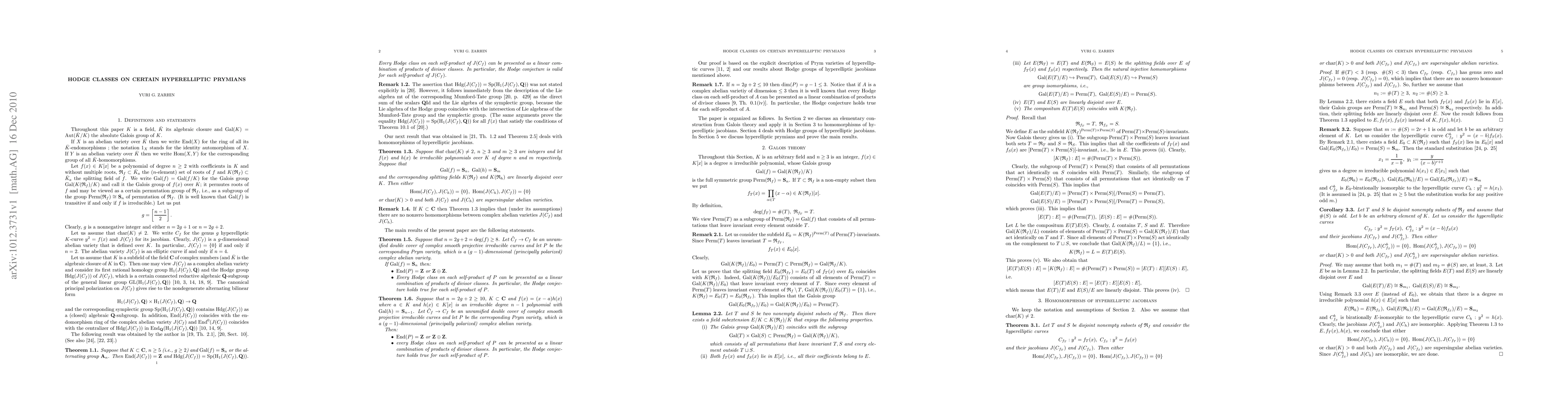 Let $n=2g+2$ be a positive even integer, $f(x)$ a degree $n$ complex polynomial without multiple roots and $C_f: y^2=f(x)$ the corresponding genus $g$ hyperelliptic curve over the field $\C$ of complex numbers. Let a $(g-1)$-dimensional complex abelian variety $P$ be a Prym variety of $C_f$ that corresponds to a unramified double cover of $C_f$. Suppose that there exists a subfield $K$ of $\C$ such that $f(x)$ lies in $K[x]$, is irreducible over $K$ and its Galois group is the full symmetric group. Assuming that $g>2$, we prove that $End(P)$ is either the ring of integers $Z$ or the direct sum of two copies of $Z$; in addition, in both cases the Hodge group of $P$ is "as large as possible". In particular, the Hodge conjecture holds true for all self-products of $P$.