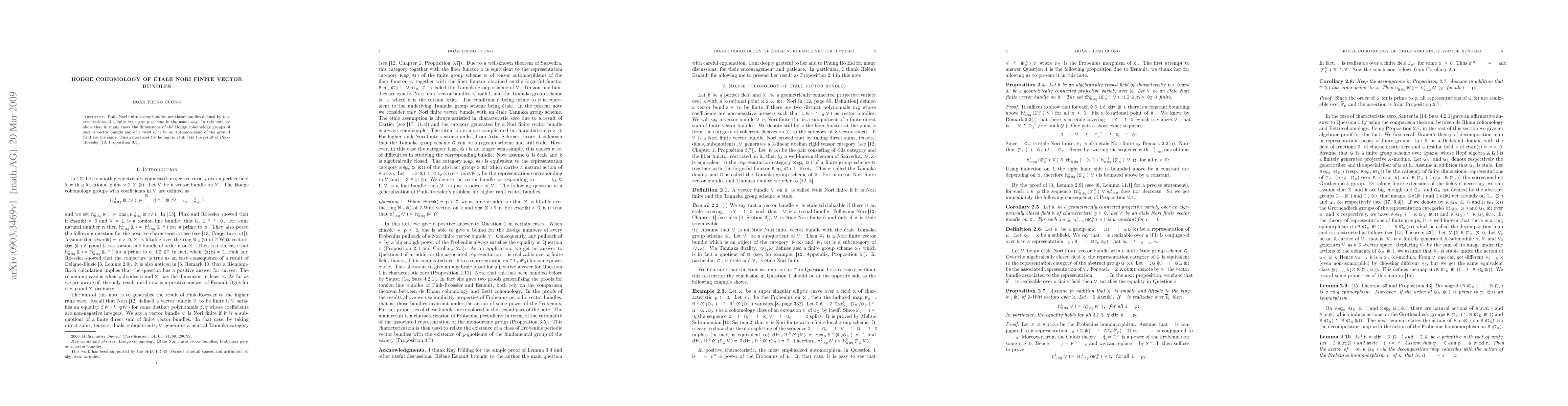 \'Etale Nori finite vector bundles are those bundles defined by representations of a finite \'etale group scheme in the usual way. In this note we show that in many cases the dimensions of the Hodge cohomology groups of such a vector bundle and of a twist of it by an automorphism of the ground field are the same. This generalizes to the higher rank case a result of Pink-Roessler.