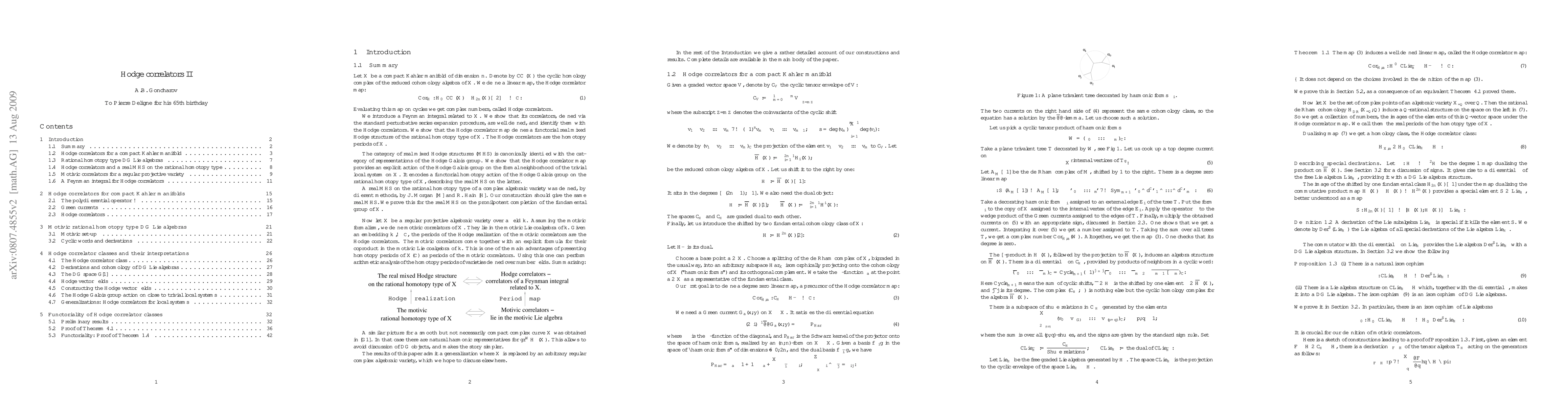We define Hodge correlators for a compact Kahler manifold X. They are complex numbers which can be obtained by perturbative series expansion of a certain Feynman integral which we assign to X. We show that they define a functorial real mixed Hodge structure on the rational homotopy type of X. The Hodge correlators provide a canonical linear map from the cyclic homomogy of the cohomology algebra of X to the complex numbers. If X is a regular projective algebraic variety over a field k, we define, assuming the motivic formalism, motivic correlators of X. Given an embedding of k into complex numbers, their periods are the Hodge correlators of the obtained complex manifold. Motivic correlators lie in the motivic coalgebra of the field k. They come togerther with an explicit formula for their coproduct in the motivic Lie coalgebra.