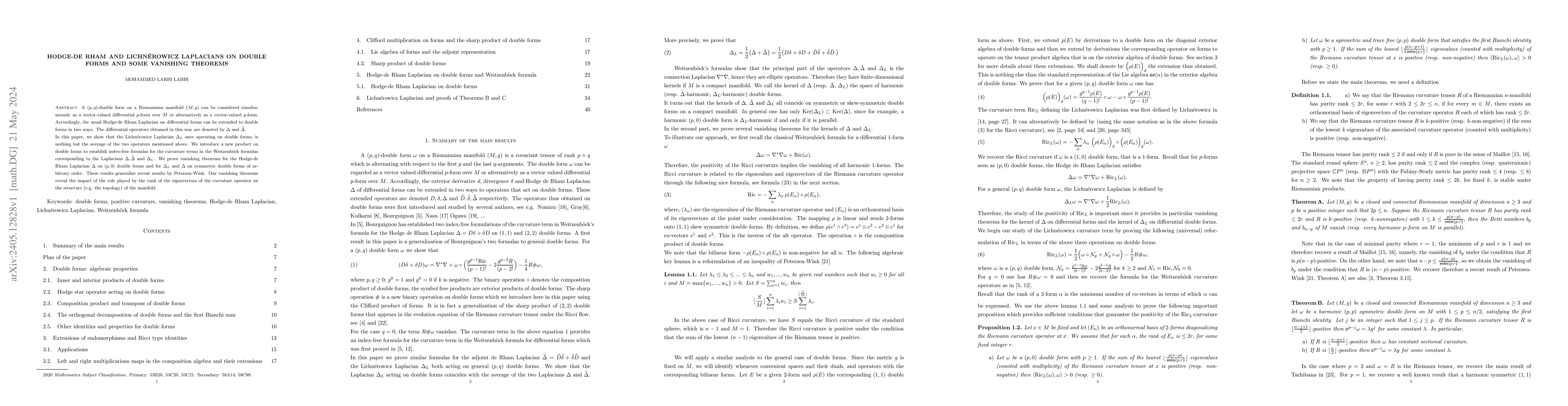This paper extends the Hodge-de Rham Laplacian to $(p,q)$-double forms and introduces the Lichnérowicz Laplacian, showing it is the average of two extended Laplacians. It proves new vanishing theorems for these Laplacians, revealing the influence of curvature eigenvectors' ranks on manifold structure.