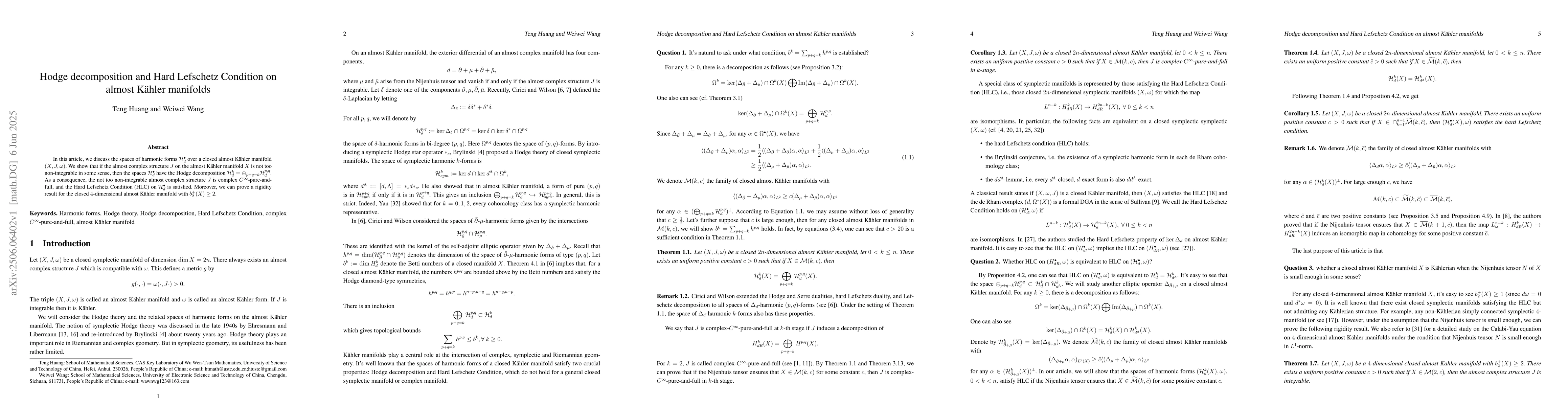 A research paper explores the Hodge decomposition on almost Kähler manifolds with non-integrable complex structures, showing its relation to the Hard Lefschetz Condition and a rigidity result for 4-dimensional manifolds.