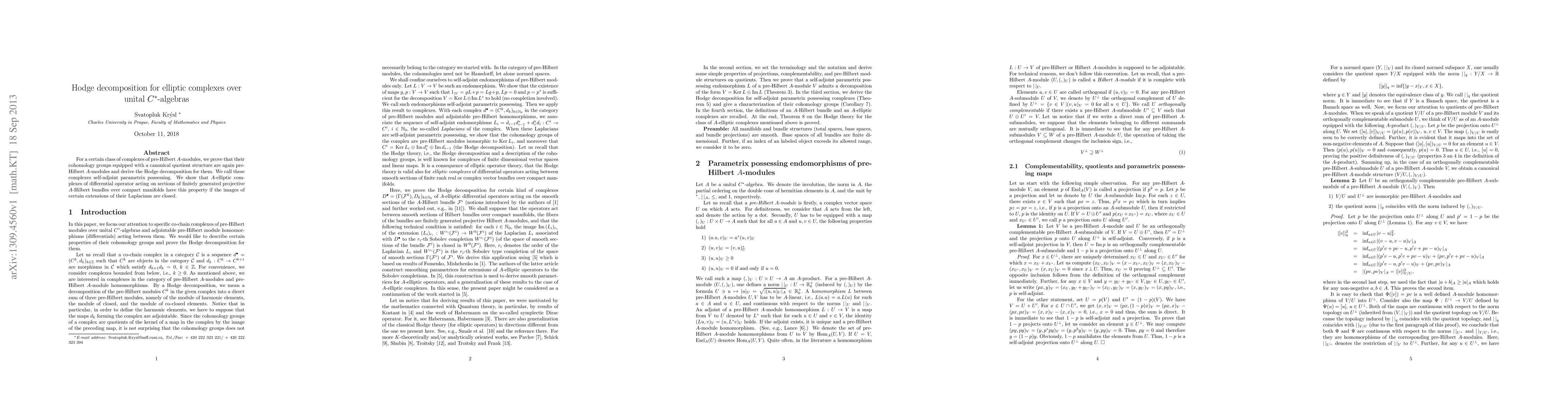 For a certain class of complexes of pre-Hilbert $A$-modules, we prove that their cohomology groups equipped with a canonical quotient structure are again pre-Hilbert $A$-modules and derive the Hodge decomposition for them. We call these complexes self-adjoint parametrix possessing. We show that $A$-elliptic complexes of differential operator acting on sections of finitely generated projective $A$-Hilbert bundles over compact manifolds have this property if the images of certain extensions of their Laplacians are closed.