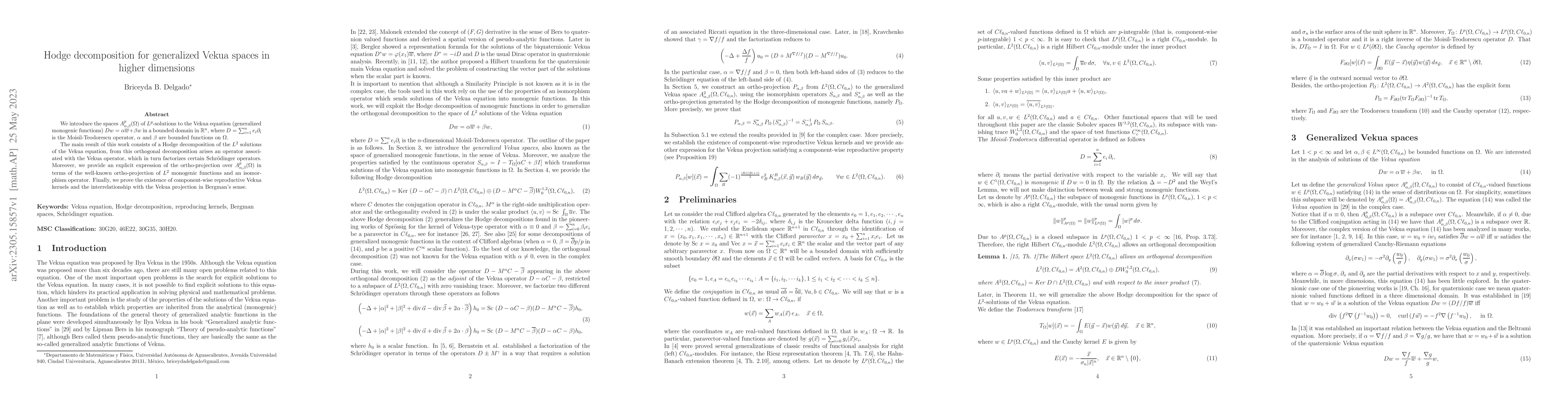 We introduce the spaces $A^p_{\alpha, \beta}(\Omega)$ of $L^p$-solutions to the Vekua equation (generalized monogenic functions) $D w=\alpha\overline{w}+\beta w$ in a bounded domain in $\mathbb{R}^n$, where $D=\sum_{i=1}^n e_i \partial_i$ is the Moisil-Teodorescu operator, $\alpha$ and $\beta$ are bounded functions on $\Omega$. The main result of this work consists of a Hodge decomposition of the $L^2$ solutions of the Vekua equation, from this orthogonal decomposition arises an operator associated with the Vekua operator, which in turn factorizes certain Schr\"odinger operators. Moreover, we provide an explicit expression of the ortho-projection over $A^p_{\alpha, \beta}(\Omega)$ in terms of the well-known ortho-projection of $L^2$ monogenic functions and an isomorphism operator. Finally, we prove the existence of component-wise reproductive Vekua kernels and the interrelationship with the Vekua projection in Bergman's sense.