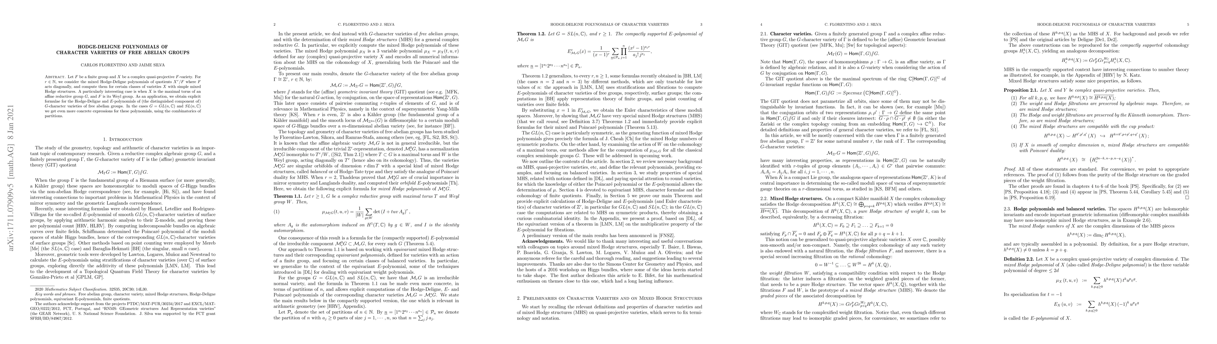 This paper computes Hodge-Deligne polynomials for character varieties of abelian groups, focusing on maximal tori of affine reductive groups and their Weyl group actions. It derives explicit formulae for the Hodge-Deligne and E-polynomials for these varieties, particularly for GL(n,C) and SL(n,C), leveraging partition combinatorics.