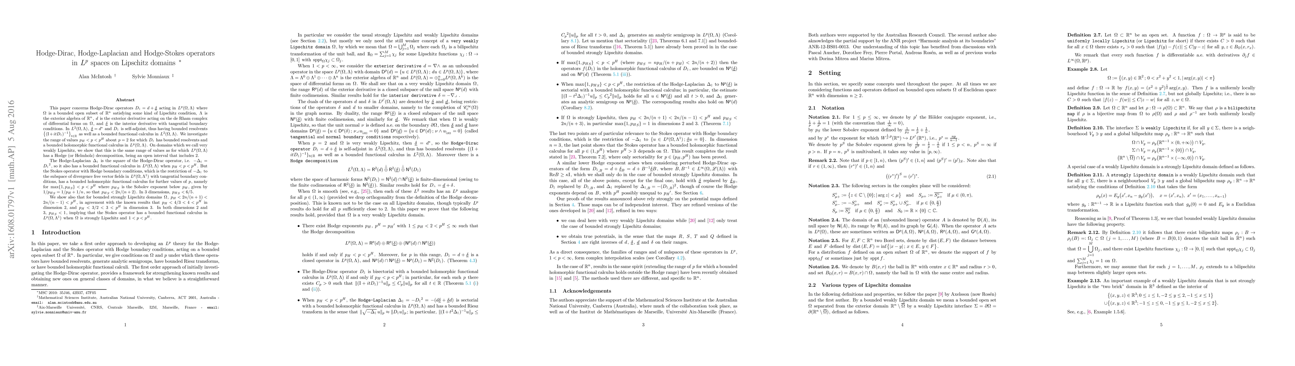 This paper concerns Hodge-Dirac operators D = d + $\delta$ acting in L p ($\Omega$, {\lambda}) where $\Omega$ is a bounded open subset of R n satisfying some kind of Lipschitz condition, {\lambda} is the exterior algebra of R n , d is the exterior derivative acting on the de Rham complex of differential forms on $\Omega$, and $\delta$ is the interior derivative with tangential boundary conditions. In L 2 ($\Omega$, {\lambda}), $\delta$ = d * and D is self-adjoint, thus having bounded resolvents (I + itD) --1 t$\in$R as well as a bounded functional calculus in L 2 ($\Omega$, {\lambda}). We investigate the range of values p H \textless{} p \textless{} p H about p = 2 for which D has bounded resolvents and a bounded holomorphic functional calculus in L p ($\Omega$, {\lambda}). On domains which we call very weakly Lipschitz, we show that this is the same range of values as for which L p ($\Omega$, {\lambda}) has a Hodge (or Helmholz) decomposition, being an open interval that includes 2. The Hodge-Laplacian {\Delta} is the square of the Hodge-Dirac operator, i.e. --{\Delta} = D 2 , so it also has a bounded functional calculus in L p ($\Omega$, {\lambda}) when p H \textless{} p \textless{} p H. But the Stokes operator with Hodge boundary conditions, which is the restriction of --{\Delta} to the subspace of divergence free vector fields in L p ($\Omega$, {\lambda} 1) with tangential boundary conditions , has a bounded holomorphic functional calculus for further values of p, namely for max{1, p H S } \textless{} p \textless{} p H where p H S is the Sobolev exponent below p H , given by 1/p H S = 1/p H + 1/n, so that p H S \textless{} 2n/(n + 2). In 3 dimensions, p H S \textless{} 6/5. We show also that for bounded strongly Lipschitz domains $\Omega$, p H \textless{} 2n/(n + 1) \textless{} 2n/(n -- 1) \textless{} p H , in agreement with the known results that p H \textless{} 4/3 \textless{} 4 \textless{} p H in dimension 2, and p H \textless{} 3/2 \textless{} 3 \textless{} p H in dimension 3. In both dimensions 2 and 3, p H S \textless{} 1 , implying that the Stokes operator has a bounded functional calculus in L p ($\Omega$, {\lambda} 1) when $\Omega$ is strongly Lipschitz and 1 \textless{} p \textless{} p H .