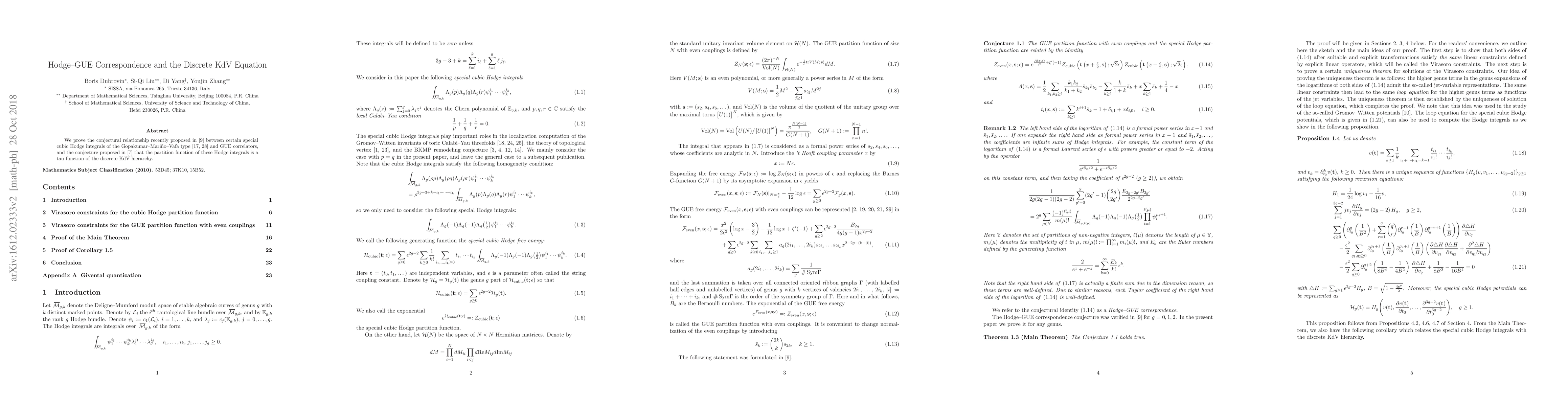 This paper establishes the connection between special cubic Hodge integrals and GUE correlators, supporting a conjecture linking them, and also proves that the partition function of these integrals is a tau function of the discrete KdV hierarchy.