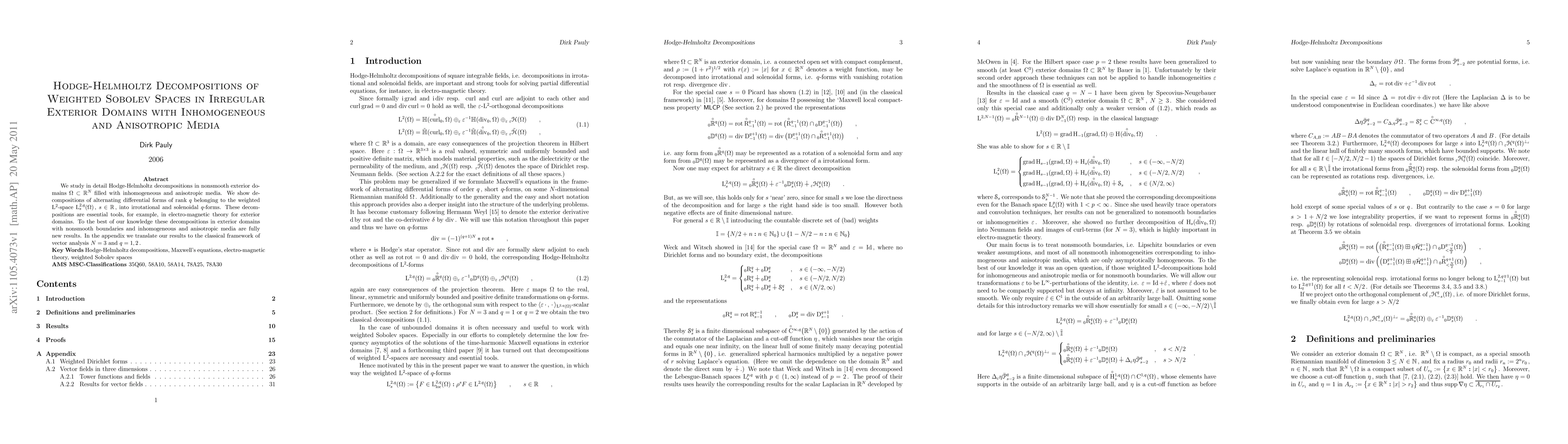 The paper presents detailed Hodge-Helmholtz decompositions for weighted Sobolev spaces in irregular exterior domains with inhomogeneous and anisotropic media, providing a mathematical foundation for electromagnetic theory in complex settings.