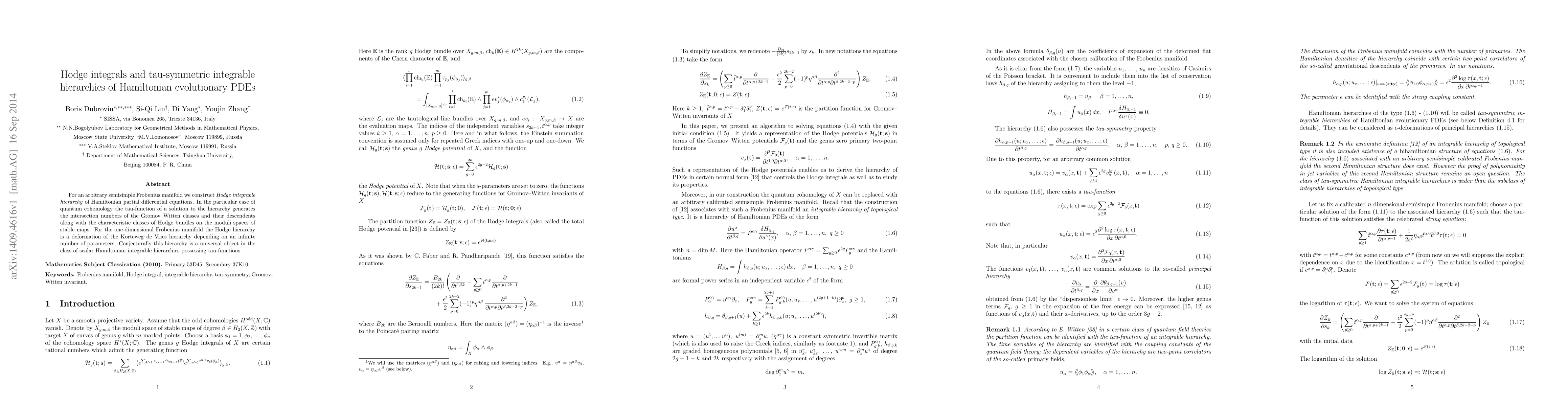 This paper constructs a Hodge integrable hierarchy of Hamiltonian PDEs for semisimple Frobenius manifolds, particularly linking the tau-function of the hierarchy in quantum cohomology to Gromov-Witten intersection numbers and characteristic classes. The one-dimensional case deforms the Korteweg-de Vries hierarchy and is conjectured to be a universal scalar Hamiltonian integrable system.