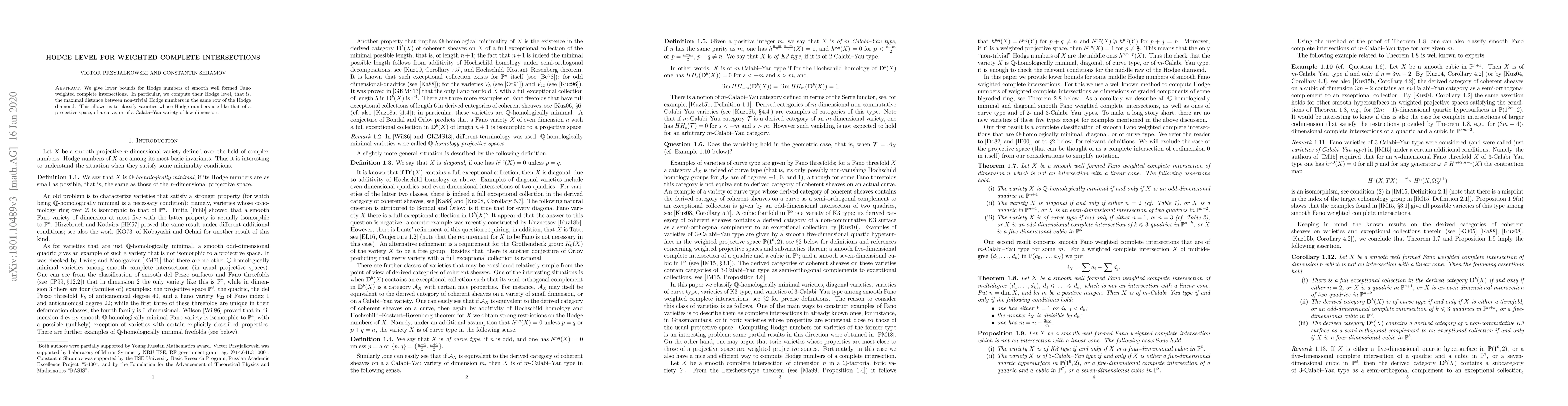 We give lower bounds for Hodge numbers of smooth well formed Fano weighted complete intersections. In particular, we compute their Hodge level, that is, the maximal distance between non-trivial Hodge numbers in the same row of the Hodge diamond. This allows us to classify varieties whose Hodge numbers are like that of a projective space, of a curve, or of a Calabi--Yau variety of low dimension.