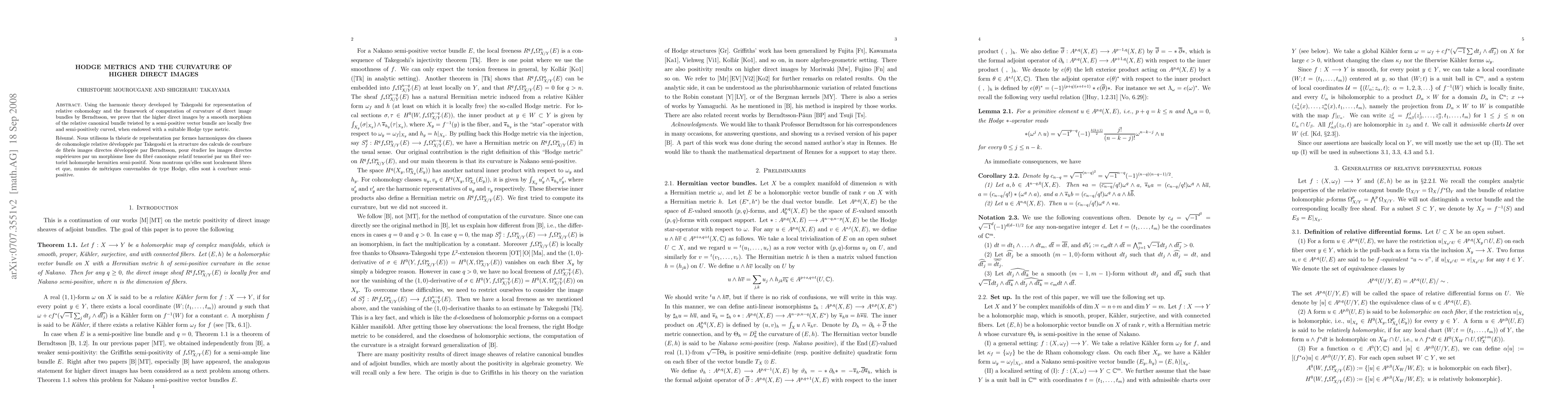 Using the harmonic theory developed by Takegoshi for representation of relative cohomology and the framework of computation of curvature of direct images bundles by Berndtsson, we prove that the higher direct images by a smooth morphism of the relative canonical bundle twisted by a semi-positive vector bundle are locally free and semi-positively curved, when endowed with a suitable Hodge type metric.